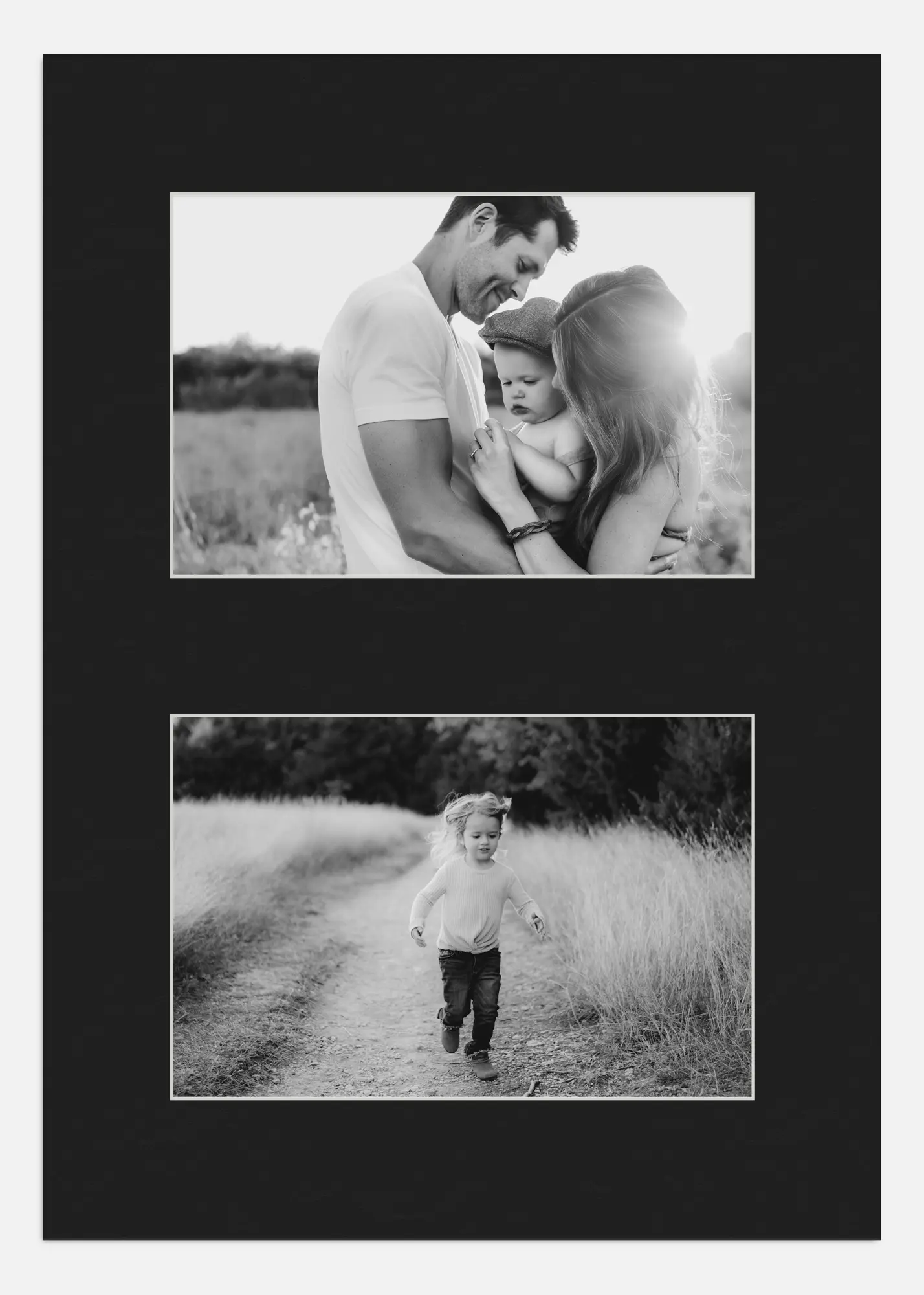 Благородно черно колаж паспарту с бели наклонени кантове от най-високо качество. В паспартуто има място за 2 снимки. Перфектно, когато искате да направите собствен фото колаж.