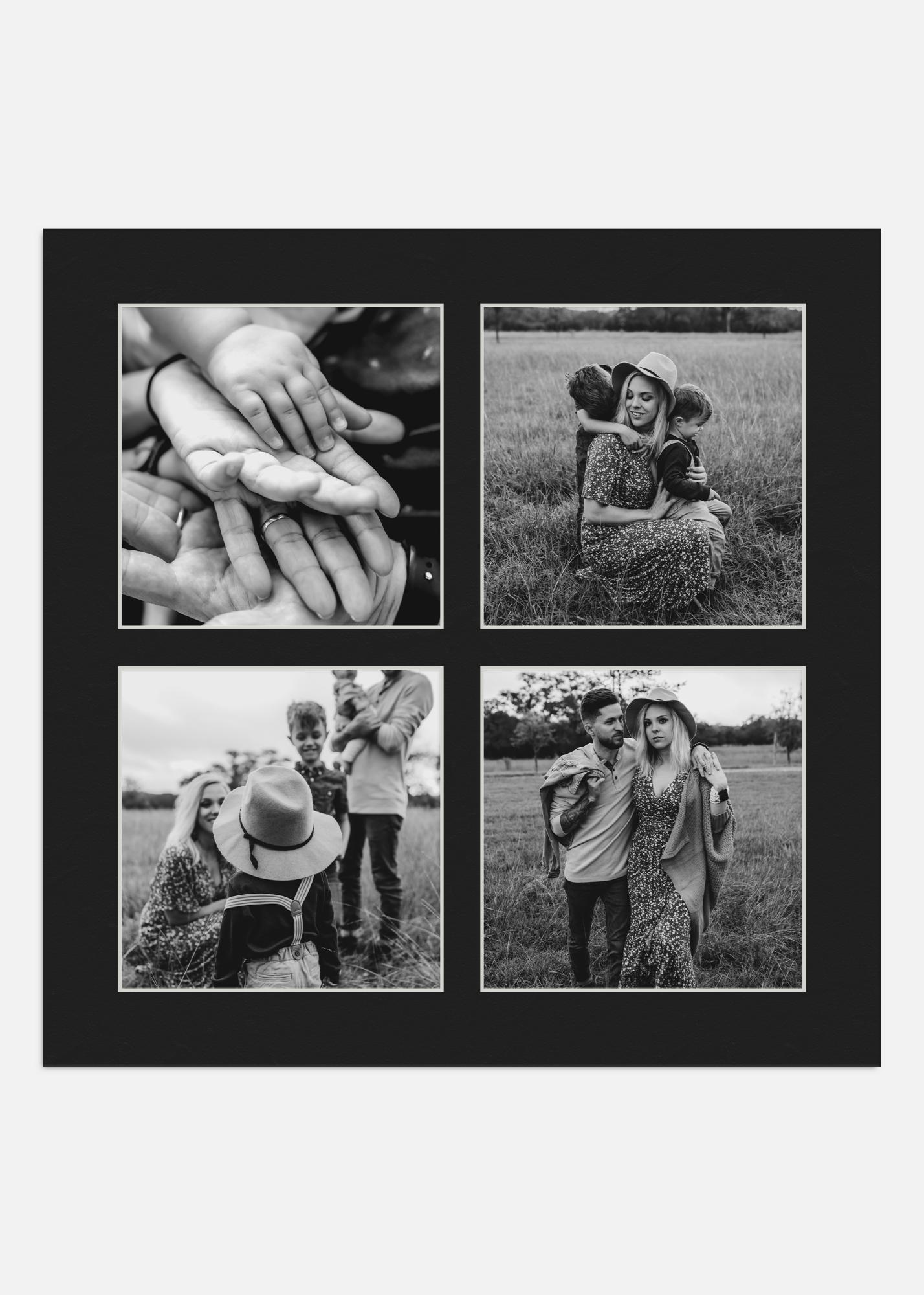 Безкиселинен черен колажен паспарту със скосяващи се бели ръбове от най-високо качество. В паспарту има място за 4 снимки. Перфектно, когато искате да създадете свой личен фотоколаж.