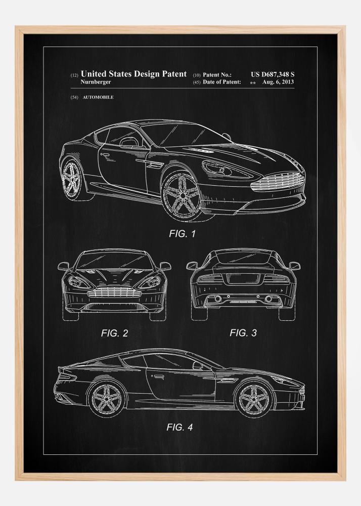 Този черно-бял патентен постер представя ексклузивния дизайн на Aston Martin, регистриран под американския патентен номер US D687,348 S, датиран на 6 август 2013 г. Патентният постер подчертава естетическия и функционален пробив в автомобилната индустрия и е възхвала на напредъка в дизайна на автомобилите. Това е креативен детайл за всички, които ценят техническия дизайн и е задължителен за колекционери и ентусиасти на технологии.