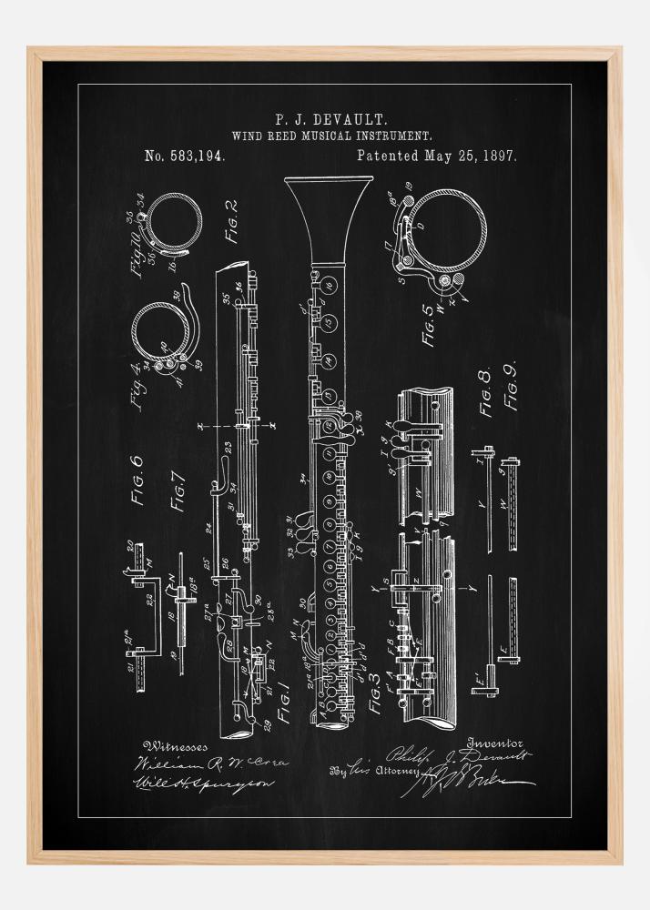 Представяме тази внушителна патентна афиша, почит към музикалната иновация и дизайн. Този постер изобразява кларинета на P.J. DeVault, патент издаден на 25 май 1897 г. под номер 583 194. Тази точна репродукция на оригиналната патентна рисунка изобразява сложната механика и красота на инструмента, перфектен акцент за всяка стая, където се оценяват музика и история.