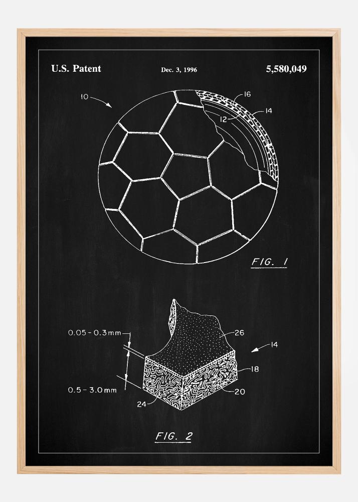 Със своето класическо черно-бяло патентно чертеж и елегантно представяне, този патентен постер е дискретен, но красноречив детайл от интериора, който пасва перфектно в дома, в офиса или в спортен бар. Детайлната скица подчертава иконската геометрия на футболната топка, както и нейната вътрешна сложност и конструкция, с размери, които придават автентично усещане. Тази патентна рисунка комбинира естетиката с науката и е вдъхновяващо напомняне за техническия напредък, който оформя нашия свят.