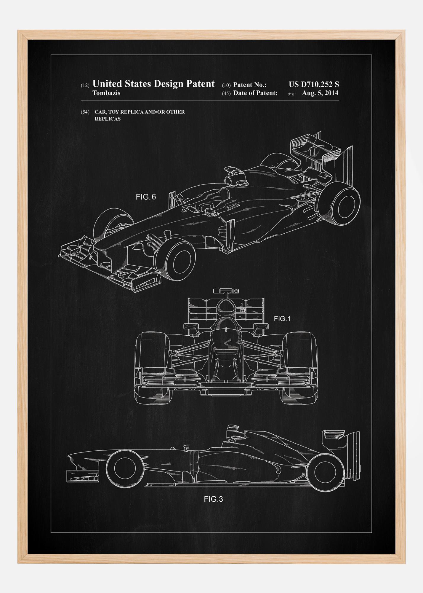 Този патентен постер подчертава елегантния и сложен дизайн на болид от Формула 1, съгласно Дизайнерски патент на САЩ US D710,252 S, датиран на 5 август 2014 г. Със своите отчетливи линии и аеродинамични форми, дизайнът на автомобила е заснет от няколко перспективи, предлагайки пълна представа за неговия емблематичен и технически усъвършенстван характер. Този дизайн е фундаментален за високата производителност и скорост, свързвани с формулното състезание.