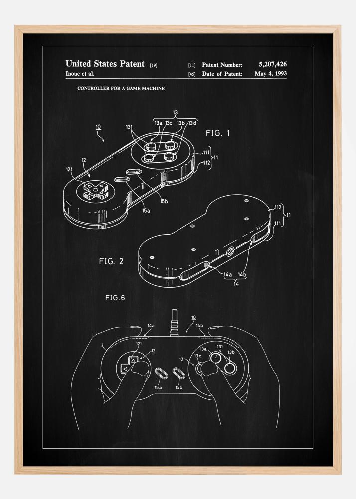 Този патентен постер подчертава класически дизайн на игрална конзола за Nintendo, патентен номер 5,207,426, датиран 4 май 1993, на стилен черен фон на дъска. Патентният чертеж показва различни изгледи на конзолата, включително отгоре, отдолу и от потребителска перспектива, което детайлно илюстрира дизайна на бутоните и лостовете, които са станали централни в взаимодействието на играчите с дигитални игрови светове.