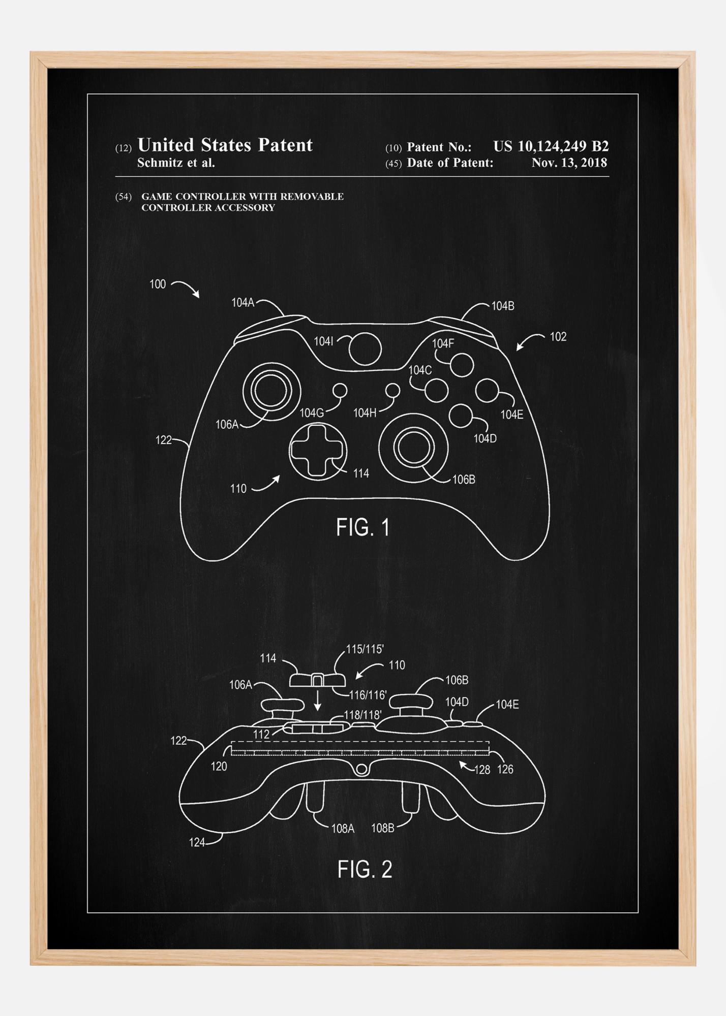 Този патентен постер с черен фон елегантно подчертава модерен гейминг контролер за Xbox с подвижен аксесоар, патентен номер US 10,124,249 B2, датиран на 13 ноември 2018 г. Напредналият дизайн и неговите компоненти са визуално представени в детайли, което дава представа как технологията и гейминг изживяването могат да бъдат персонализирани за потребителя. Това е проява на непрекъснатите иновации, които се случват в света на гейминг контролерите.