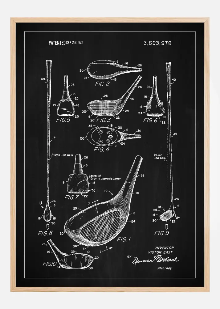 Този патентен постер е почит към голф ентусиаста и изобретателя, подчертавайки усъвършенстван дизайн на голф клуб, който е патентован на 26 септември 1972 г. с патентен номер 3,693,978. Различните фигури, от FIG. 1 до FIG. 10, илюстрират клуба от няколко ъгли и сечения, подробно описвайки неговия геометричен център и разпределение на теглото. Тази патентна чертеж е не само художествена интерпретация на техническа документация, но също така емблематично произведение, което обединява световете на спорта и дизайна.