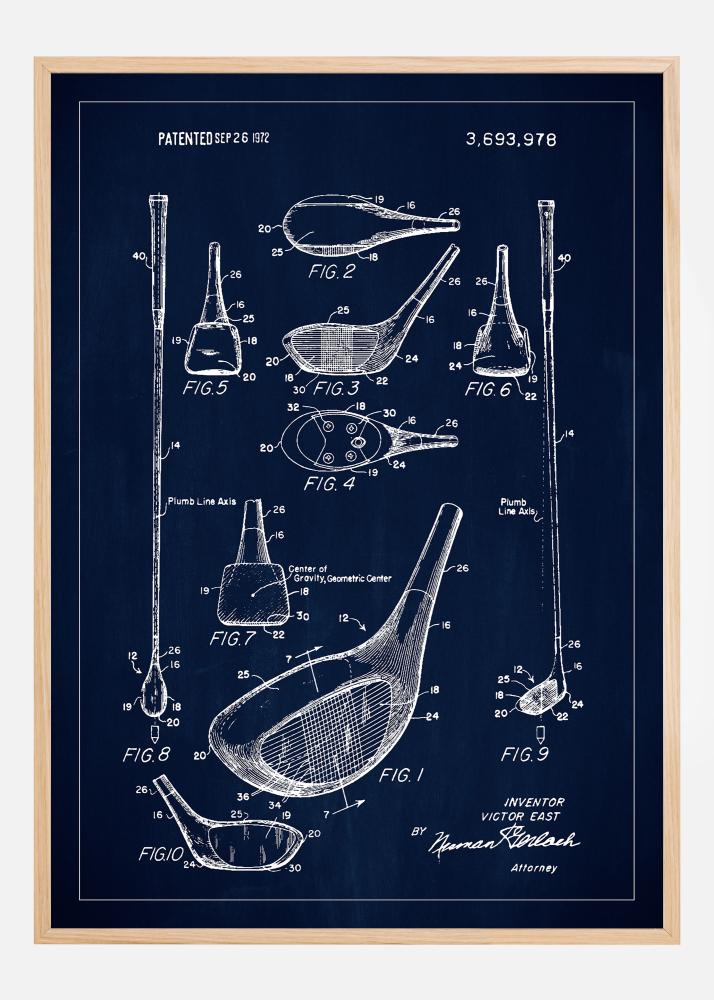 Този стилен патентен постер представя подробно илюстрирана графика на патент за голф клуб, издаден на 26 септември 1972 г., под патентен номер 3,693,978. Всеки аспект на дизайна е изложен чрез серия от обмислени фигури, от пълни дължини до детайлни прегледи на главата на клуба. Тази умело изпълнена патентна графика е почит към технологичния напредък на спорта и подчертава находчивостта и прецизността на изобретателя.