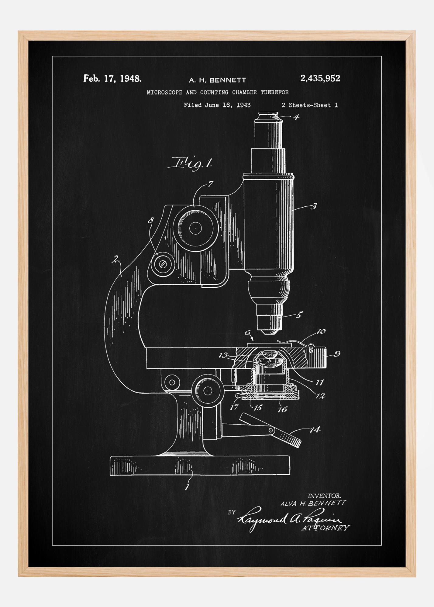 Този патентен плакат представя елегантен черен фон, който елегантно подчертава класическа патентна рисунка на микроскоп от 17 февруари 1948 г. Белите линии на тъмния фон създават драматичен ефект и илюстрират конструкцията на микроскопа и иновативните характеристики на неговата броячна камера. Това е иконично изображение на научна прецизност и красота във функционалния дизайн.