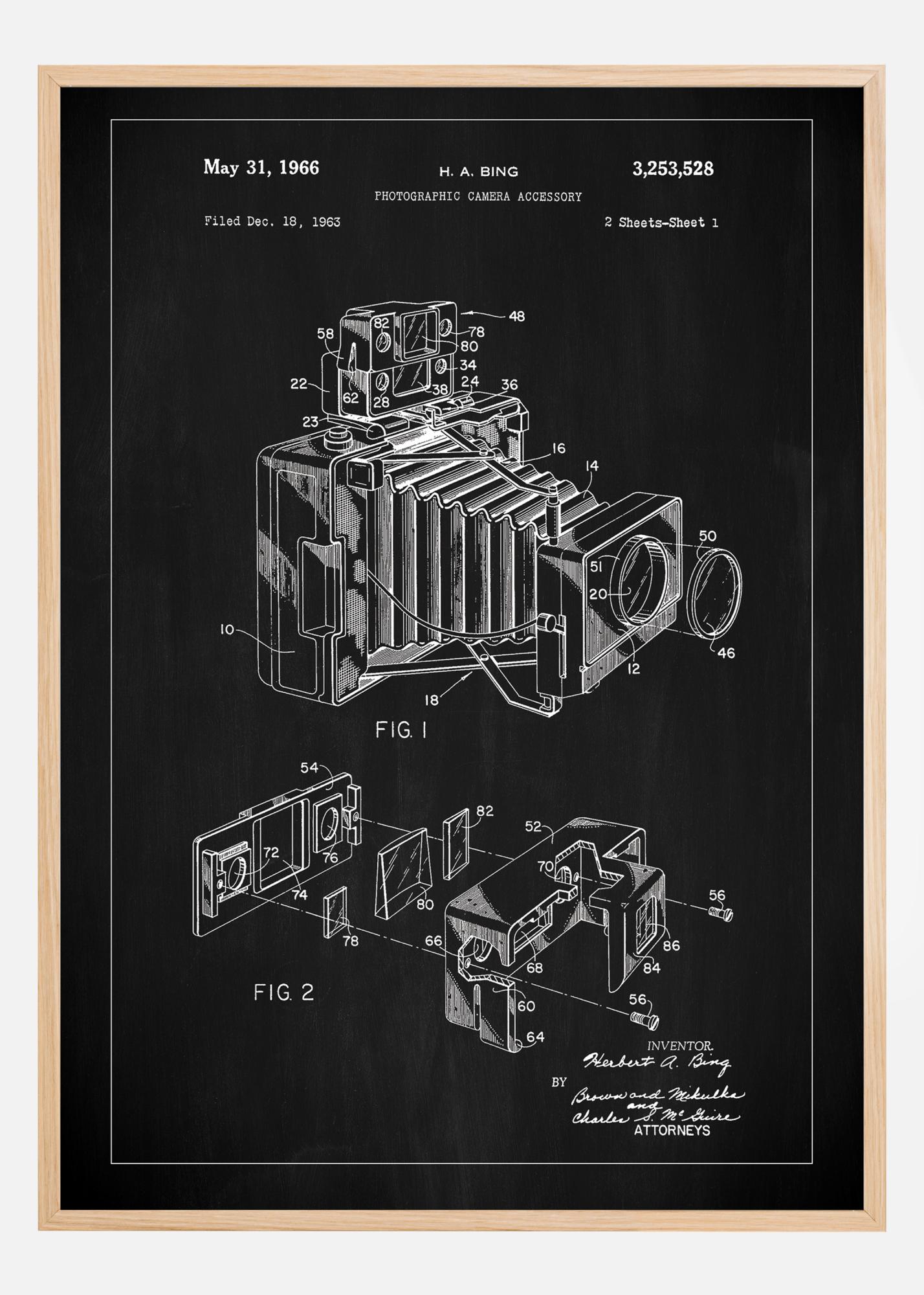 Този изискан патентен постер с черна дъска фон предлага силно и стилно представяне на фотографски аксесоар за камера, патент номер 3,253,528, издаден на 31 май 1966 г. Със своята остра бялолинейна илюстрация, която се откроява на тъмния фон, чертежът предлага детайлен изглед на техническа иновация, която е придвижила фотокартината напред. Патентният плакат е почит към времето, когато фотографията започна да прави големи крачки в технологичното развитие.