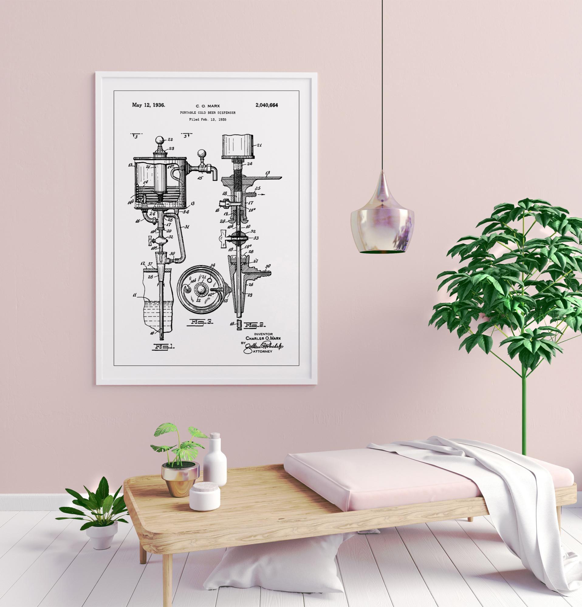Този художествен патентен постер изобразява детайлния дизайн на преносим дозатор за студена бира, който е патентован от Чарлз О. Маркс на 12 май 1936 г. Патентният номер 2,040,664 гордо е представен над прецизно изработения апарат, където всяка линия и детайл вдъхват живот на уникално творение от индустриалната ера. Елегантният черно-бял контраст прави този патентен чертеж вечен декоративен елемент, който идеално пасва както в изискана всекидневна, така и в стая за събирания на ентусиаст.