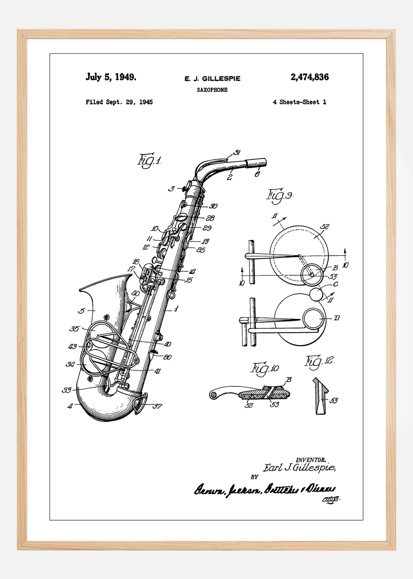 Тази внимателно детайлизирана патентна постер показва чертеж на патента за саксофон, датиран от 5 юли 1949 г. Това е изключителен пример за техническата конструкция и дизайн на музикален инструмент, подчертан от ясните линии и прецизни маркировки на патента. За любителите на музиката, инструменталистите и познавачите на редки диаграми, този патентен афиш е стилна почит към творческия процес зад създаването на саксофон.