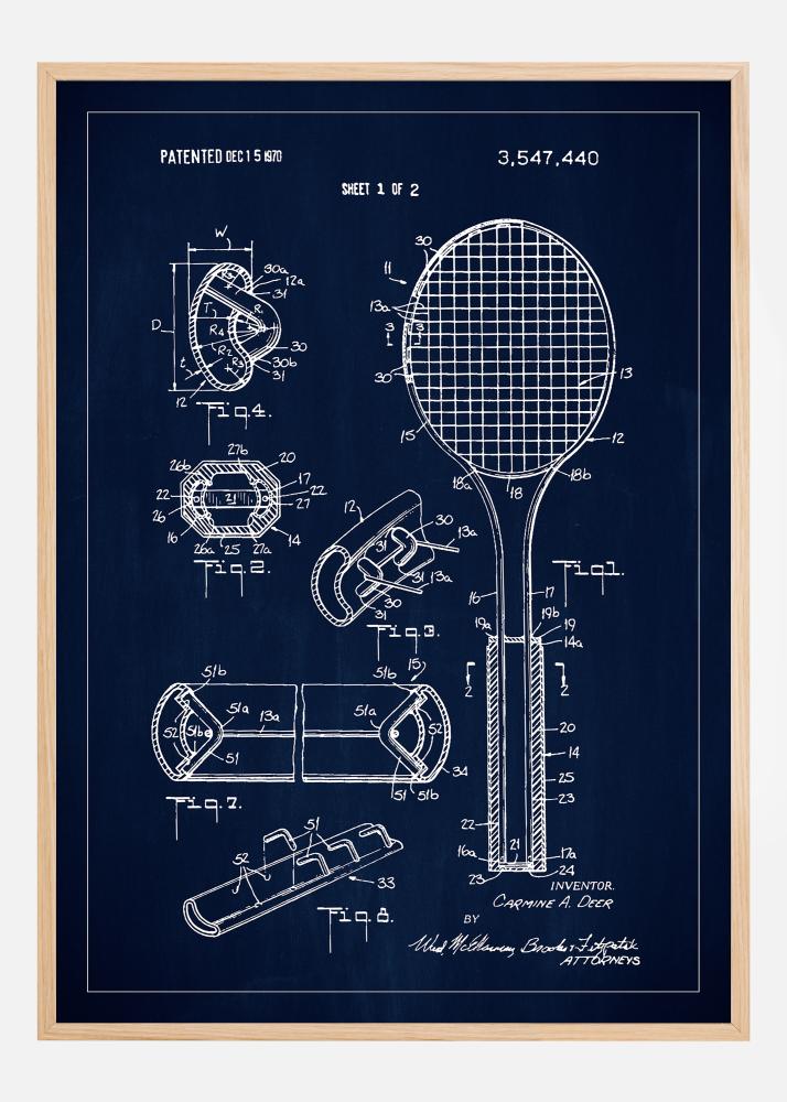 Илюстрацията не е само елегантна декорация, но и източник на вдъхновение и почит към изобретателността в света на спорта. Точните размери и внимателно нарисуваните детайли предизвикват възхищение към прецизността и майсторството, които стоят зад производството на тенис ракета. Това е перфектна патентна рисунка, която да окачите в игрална стая, офис или спортен бар, за да придадете автентично и интелектуално усещане на помещението.
