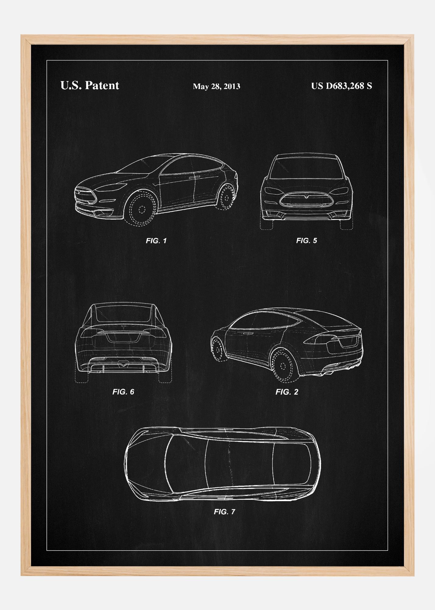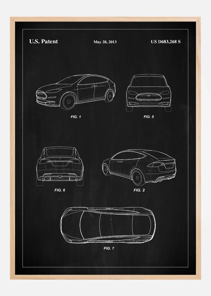 Този елегантен и изискан патентен постер е възхвала на съвременния автомобилен дизайн на Tesla, документиран чрез американския патент с номер US D683,268 S на 28 май 2013 г. Постерът показва отличителна автомобилна скулптура, която определя върха на автомобилното производство. Всяка линия и крива е внимателно скицирана в бяло на черната дъска, което създава величествен контраст, който привлича и задържа вниманието на наблюдателя.