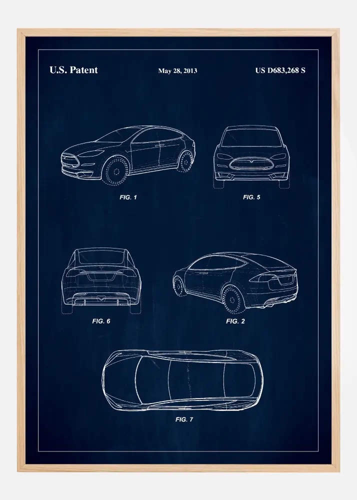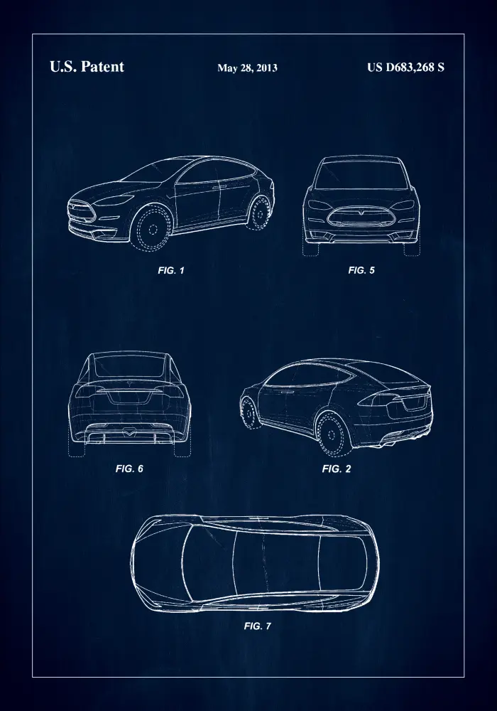 Гордо представяме този патентен постер, графична репрезентация на US D683,268 S, издаден на 28 май 2013 г., който изобразява автомобилен дизайн на Tesla, толкова иновативен, колкото и естетически привлекателен. Постерът е идеално допълнение към всеки колекционерски дом или работно място и предлага уникален поглед в процеса на проектиране зад една от най-забележителните форми в автомобилната индустрия.