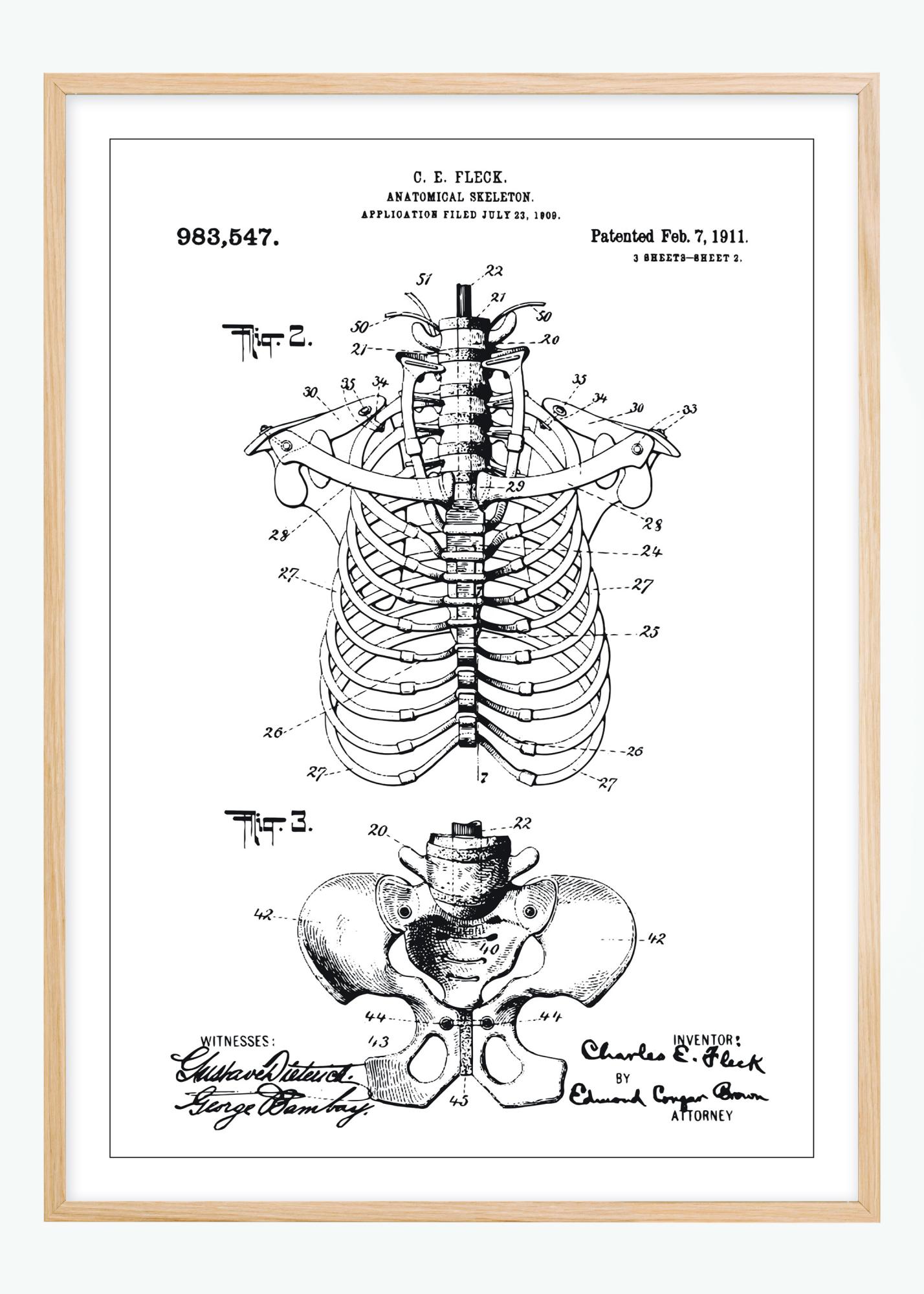 Този патентен постер представя детайлна илюстрация на анатомична конструкция на скелет, патентована от C.E. Fleck на 7 февруари 1911 г., под патентен номер 983,547. Чертежът, подаден на 23 юли 1909 г., подчертава структурата на скелета и механичните връзки, конкретно как са конструирани ребрата и гръбначният стълб, за да се представи човешката анатомия точно и педагогически.
