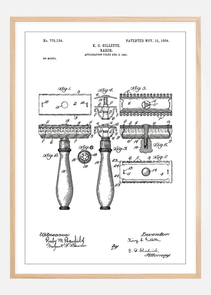 С емблематичен и стилен дизайн този патентен постер представя революционното творение на К.Г. Жилет: самобръсначката, патентована на 15 ноември 1904 г., патентен номер 775,134. Подробностите в този патентен чертеж подчертават механичните аспекти и новаторската конструкция, които промениха личната хигиена завинаги, и това беше документирано за първи път през декември 1901 г.