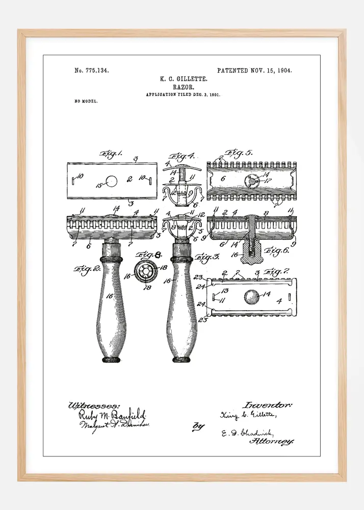 С иконичен и стилен дизайн, този патентен постер представя революционното творение на K.G. Джилет: бръсначът, патентован на 15 ноември 1904 г., патент номер 775,134. Детайлите в тази патентна рисунка подчертават механичните аспекти и новаторската конструкция, която промени личната хигиена завинаги, и това бе документирано за първи път през декември 1901 г.
