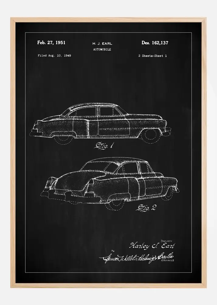 Този патентен чертеж представлява време, когато автомобилният дизайн беше в преход, и комбинира техническо майсторство с естетично изразяване. Плакатът е прекрасна почит към дизайнерството на автомобили и би бил отлична декорация за колекционери, ентусиасти на автомобили или всеки, който оценява класическия американски дизайн. Той е както артистично произведение, така и част от историята на индустриалния дизайн и присъствието му обогатява всяка стая с усещане за ретро елегантност.