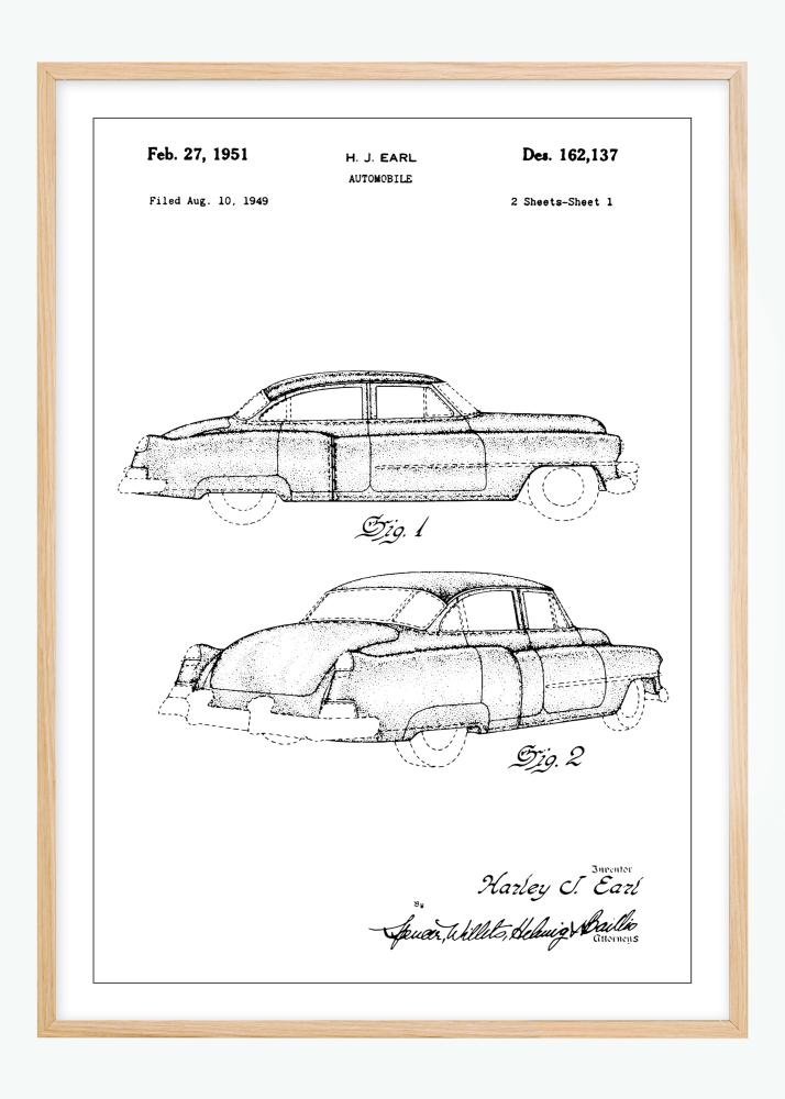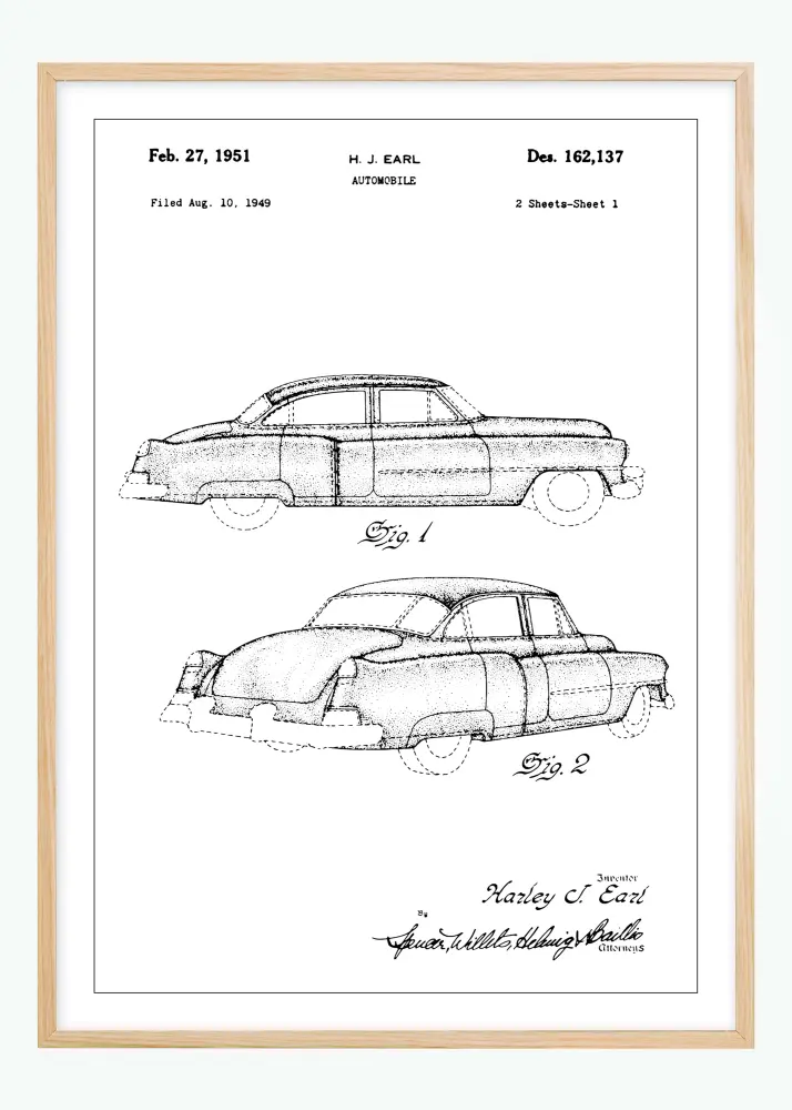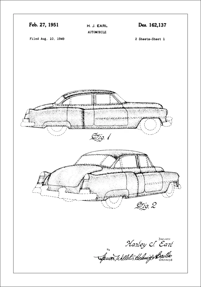 Този патентен постер представя изискана автомобилна рисунка на Cadillac, проектирана от известния Х. Дж. Ърл. Датирана на 27 февруари 1951 г., с патентен номер Des. 162,137, първоначално подадена на 10 август 1949 г., тази картина улавя същността на следвоенната автомобилна индустрия. Мотивът е почит към златната ера на американския автомобил и е създаден с внимание към детайла, което привлича както автомобилни производители, така и любители на дизайна.
