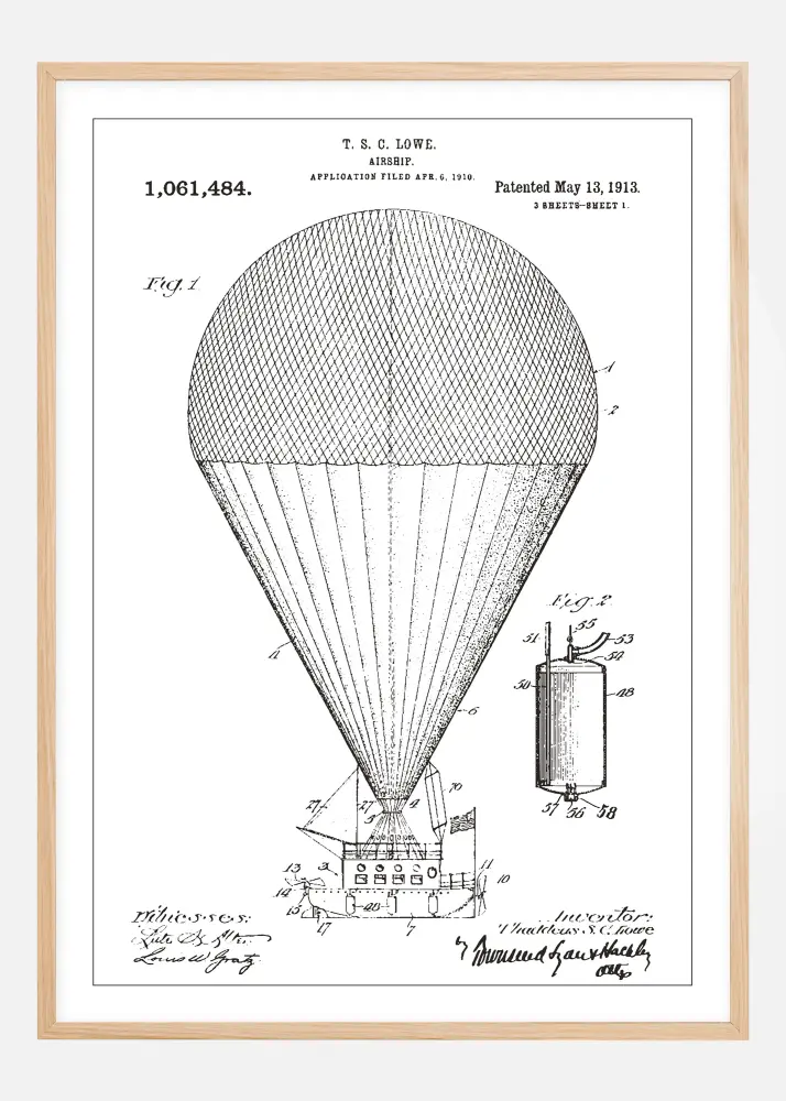 Този патентен постер предлага фантастично представяне на дирижабъла на Т. С. Лоу, важна конструкция, която е част от историята на авиацията. С патентен номер 1,061,484, издаден на 13 май 1913 г., този афиш улавя същността на една новаторска ера. Неговият детайлен чертеж предлага завладяващ поглед към дизайна и инженерството от началото на 20-ти век.