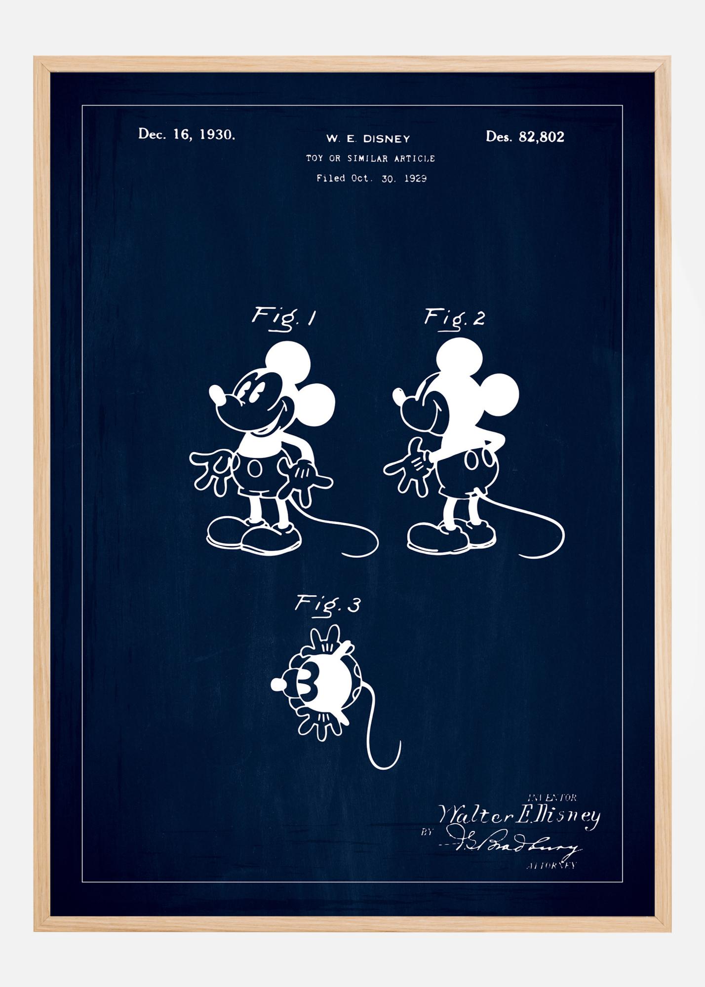 Този патентен постер подчертава класически дизайн, документиран в патент Des. 82,802, издаден на 16 декември 1930 от У.Е. Дисни. Мотивът включва три фигури на Мики Маус, показващи различни ъгли и детайли на дизайна: един характер отпред, един в профил и един детайл на ръката, всички номерирани, за да илюстрират специфичните черти на тази иконична форма.