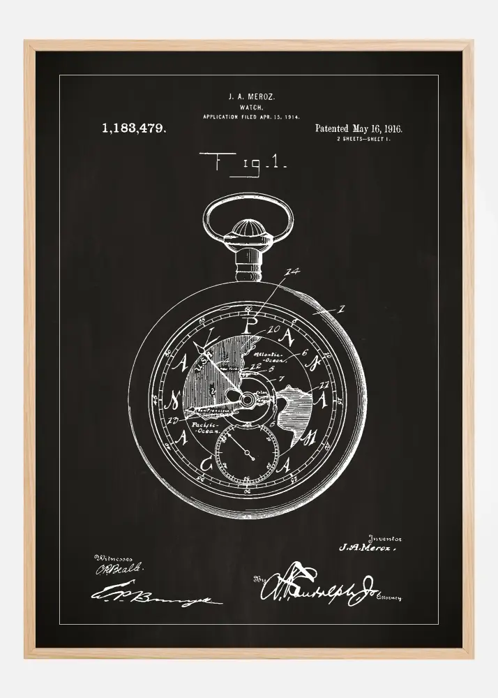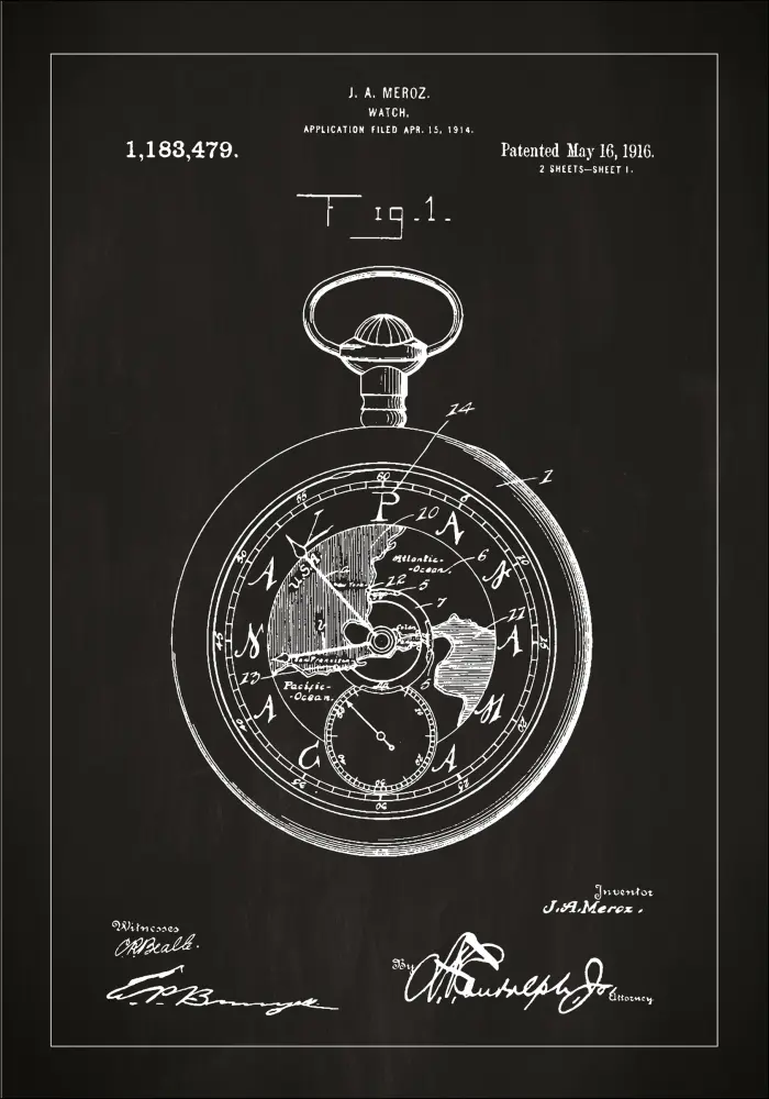 Този изискан постер на патент изобразява вечната изобретение на джобния часовник, патентиран от Й.А. Мероз на 16 май 1916 г., под патентен номер 1,183,479. Подробният чертеж на патента показва сложен дизайн на механизма, пълен с механични детайли, които отразяват епохата, когато прецизността в измерването на времето се превърна в изкуство само по себе си.
