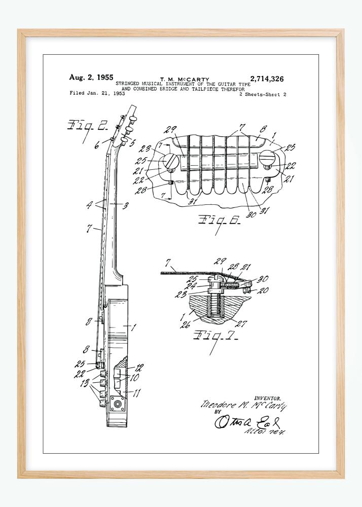 Този патентен постер показва изобретение за струнен музикален инструмент, конкретно електрическа китара, с патент, издаден на 2 август 1955 г. под номер на патент 2,714,326. Изобретателят, Теодор М. МакКарти, е подал заявката на 21 януари 1953 г. Илюстрациите дават детайлни изгледи на грифа, тялото и главата на инструмента, както и напречен разрез, който показва как струните са свързани както със стойката, така и с опашката на китарата.