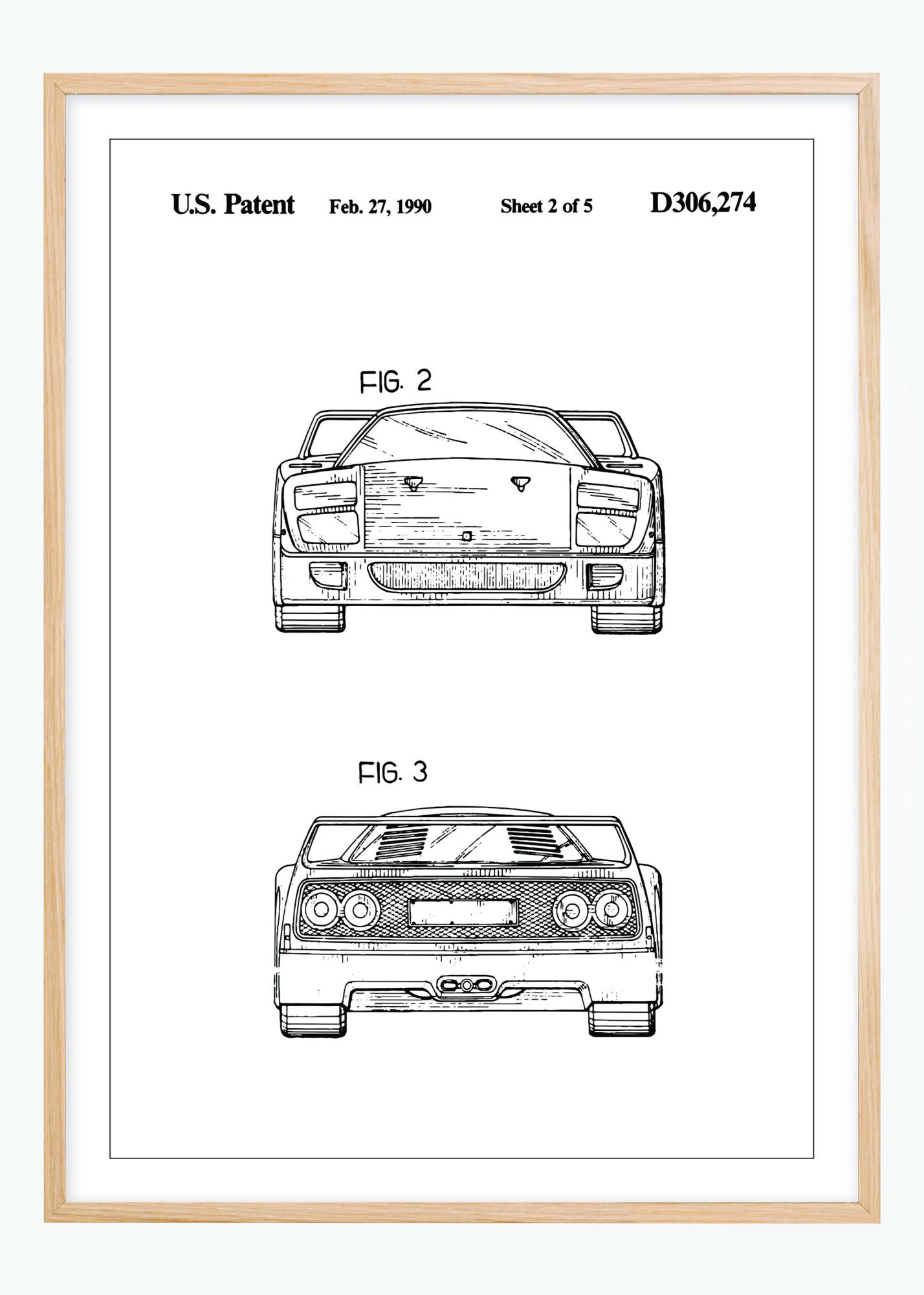 Този патентен постер изобразява задния дизайн на Ferrari F40, който е патентован на 27 февруари 1990 г. под номер D306,274. Чертежите показват предната и задната част на автомобила с неговото характерно светлинно разпределение, брони и форма. Детайлите в илюстрациите подчертават уникалните дизайнерски елементи, които отличават този модел автомобил и допринасят за неговото разпознаване по пътищата.