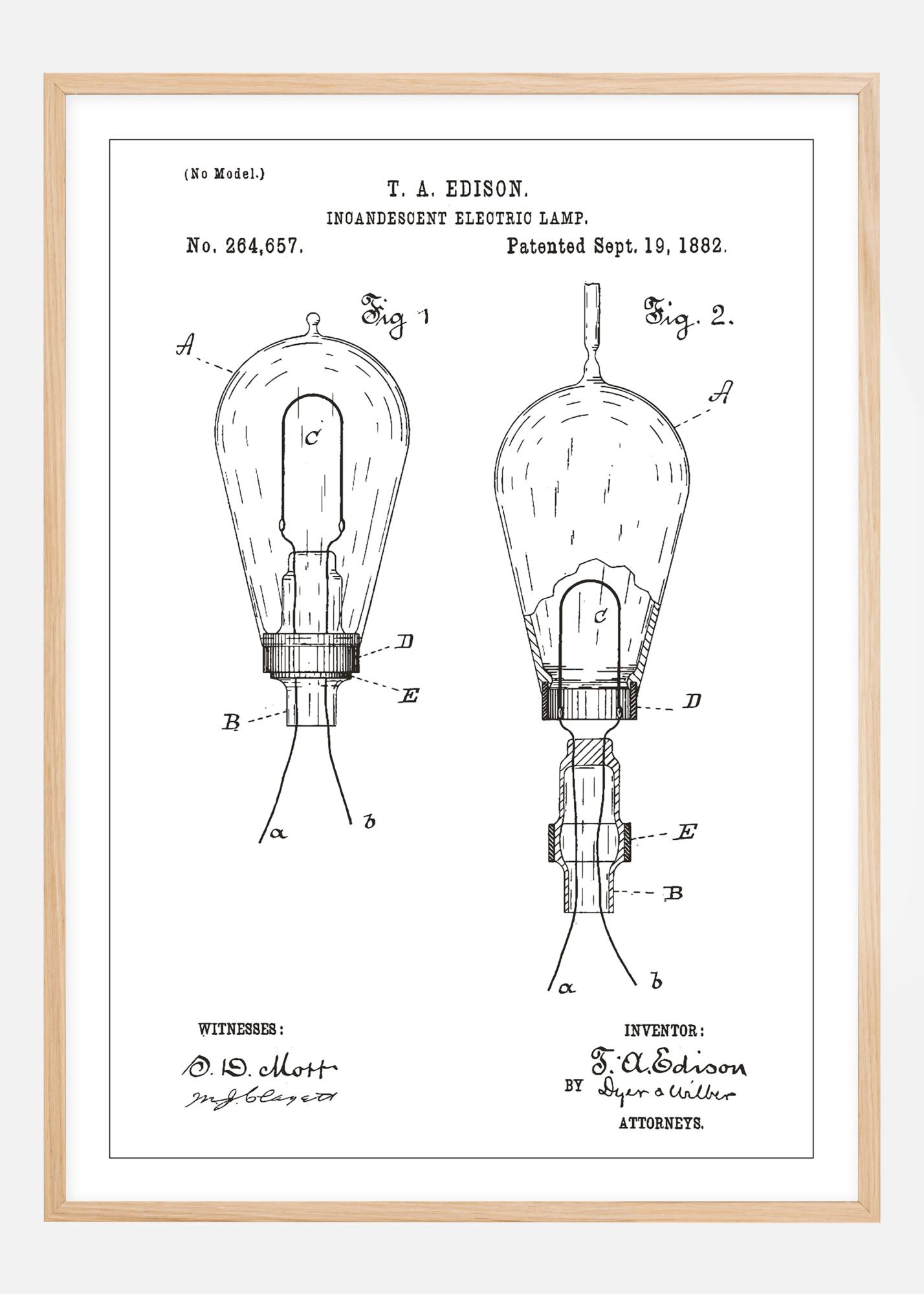 Този специално изработен патент разкрива красотата на дизайна на Т. А. Едисон на електрическа лампа, която оформи съвременния свят чрез патент номер 264,657, издаден на 19 септември 1882 г. Подробната илюстрация осветява техническите аспекти на ранна версия на електрическата лампа, която беше една от първите комерсиално успешни електрически лампи. Този патентен плакат е перфектен трибют към един от най-влиятелните изобретатели на всички времена и неговия принос към електрическото осветление.