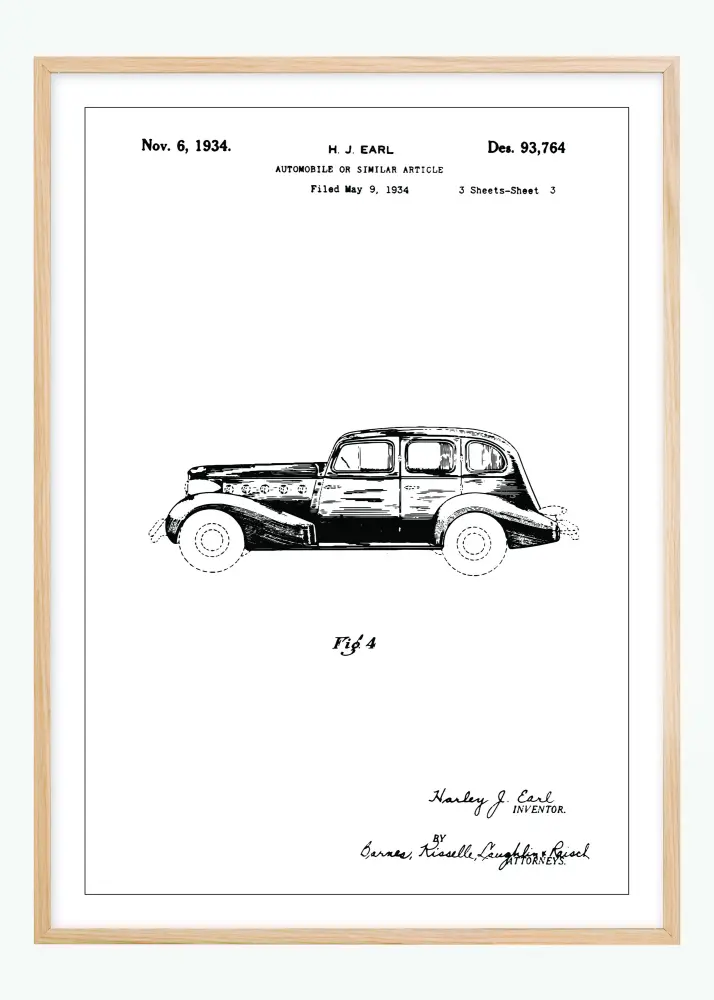 Този патентен постер изобразява автомобил, патентован от Х. Дж. Ърл на 6 ноември 1934 г. под патентен номер Des. 93,764. Изобретението се отнася до автомобил или подобна статия, както е посочено в заявката, подадена на 9 май 1934 г. Рисунката представя страничен изглед на превозното средство, който дава ясна представа за неговия дизайн и пропорции, типични за този период.