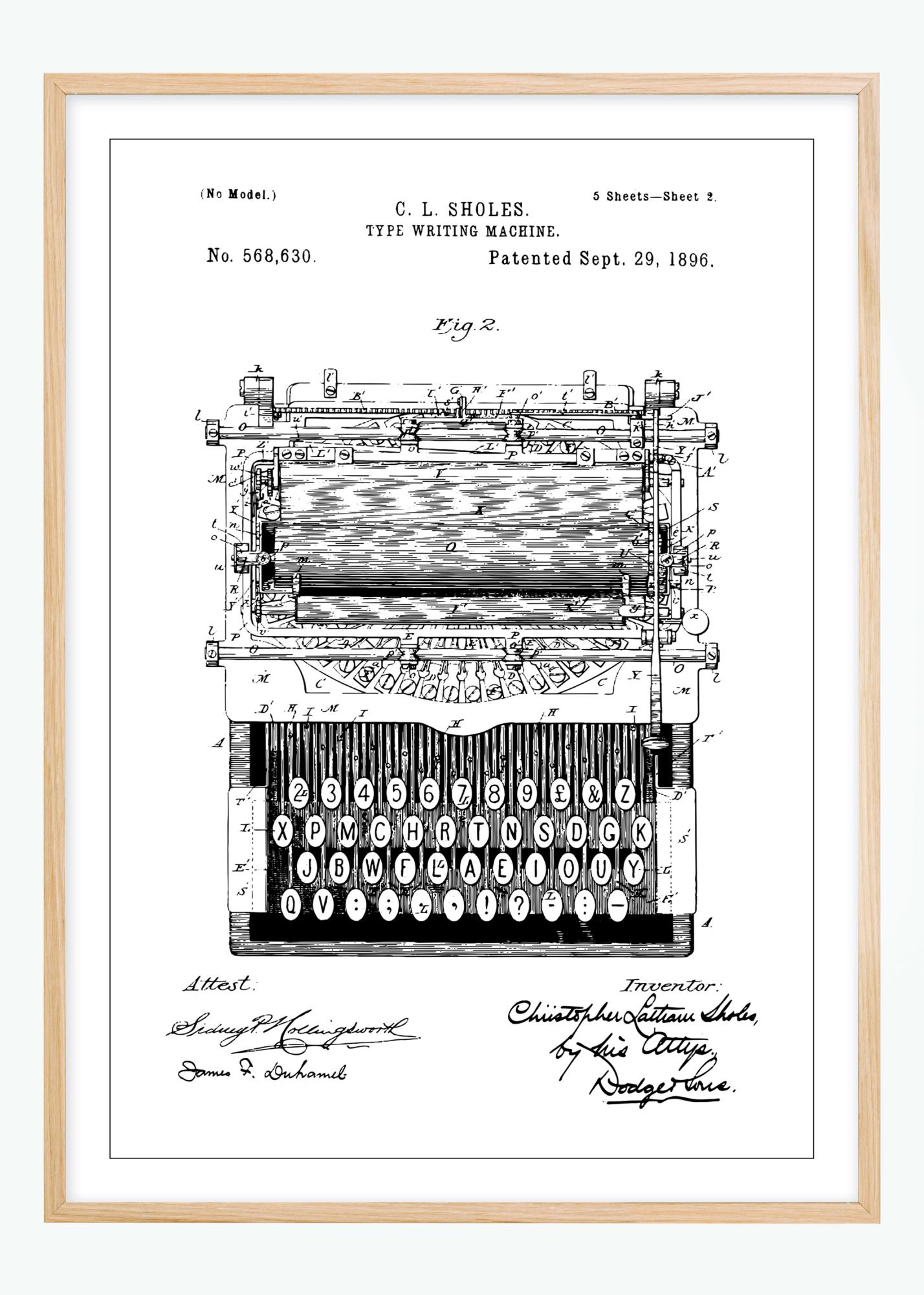 ФИГ. 2 показва сложен вътрешен изглед на пишещата машина, включително нейния клавиатурен набор и механични детайли. Подписът на изобретателя Sholes, заедно с подписите на двамата свидетели, добавя автентичен и личен аспект към този патентен постер. Това е отлична тема за разговор за всеки, който има интерес към технологии и история, и би изглеждало отлично на стените в офис, библиотека или в пространството на колекционер.