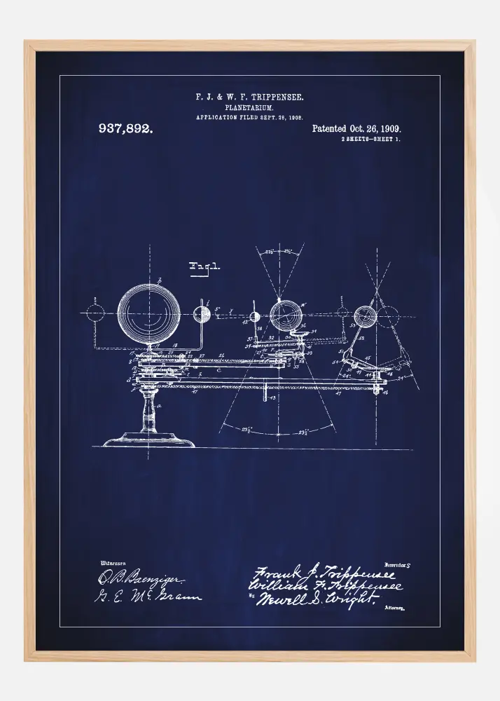 Този величествен патентен постер представя патентната рисунка на планетариум, издаден на F. J. & W. F. Trippensee под патентен номер 937,892. Патентът, който официално е регистриран на 26 октомври 1909 г., е шедьовър на техническото чертане и дизайн, който въплъщава научните стремежи и изобретателност на времето. Мотивите дават представа за инструментите на ранната астрономия и той е ексклузивна декорация за всеки, който има интерес към историята на науката или който цени старинните научни инструменти.