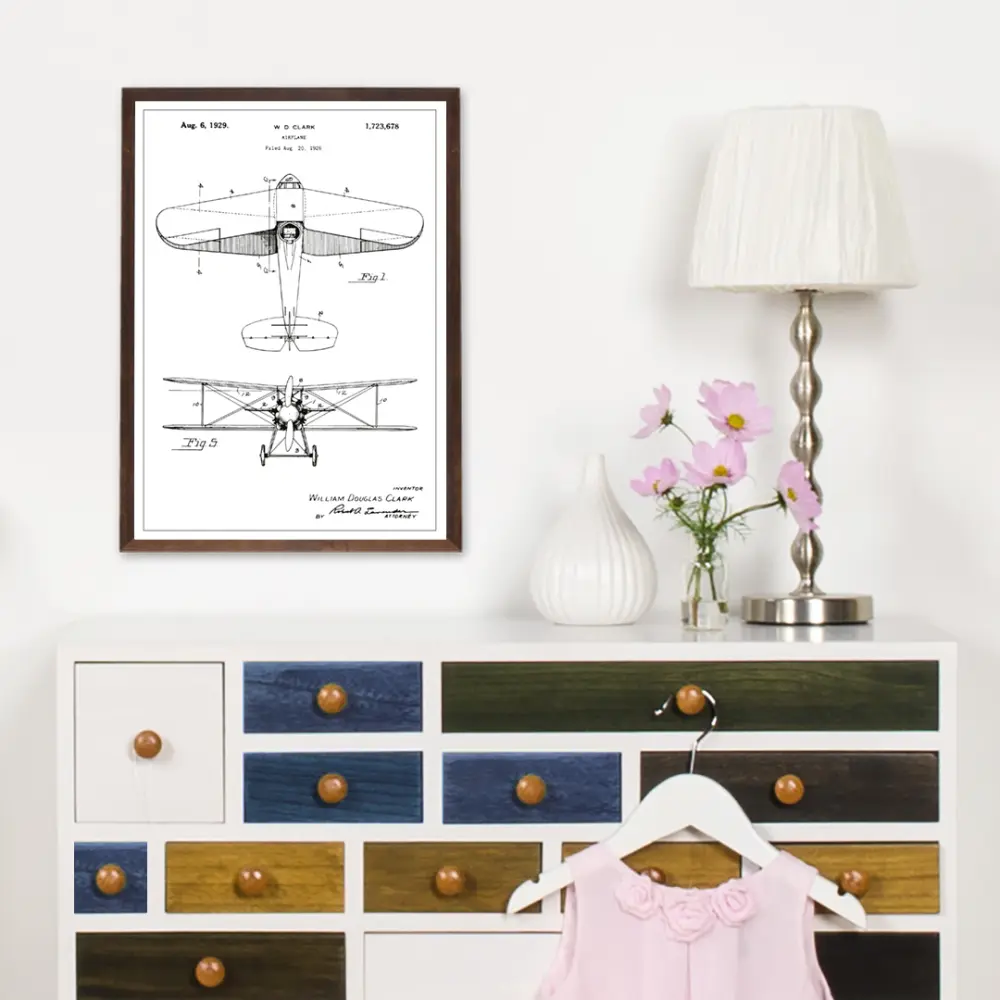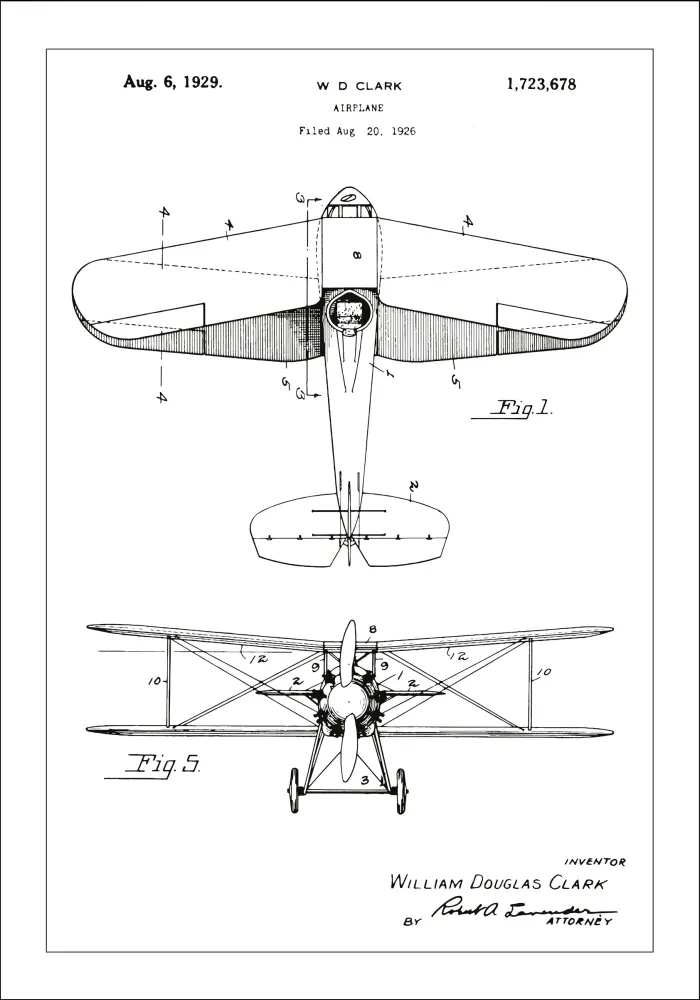 С класическа простота този патентен постер улавя конструирането на самолет от W D Clark, дизайн, който въплъщава духа на ранната авиация. Патентът е издаден на 6 август 1929 под номер 1,723,678 и тази илюстрация е времева капсула на иновацията. Чистите линии и остри детайли на постера отдават почит на техническите постижения, които бяха от решаващо значение за бъдещето на авиацията.