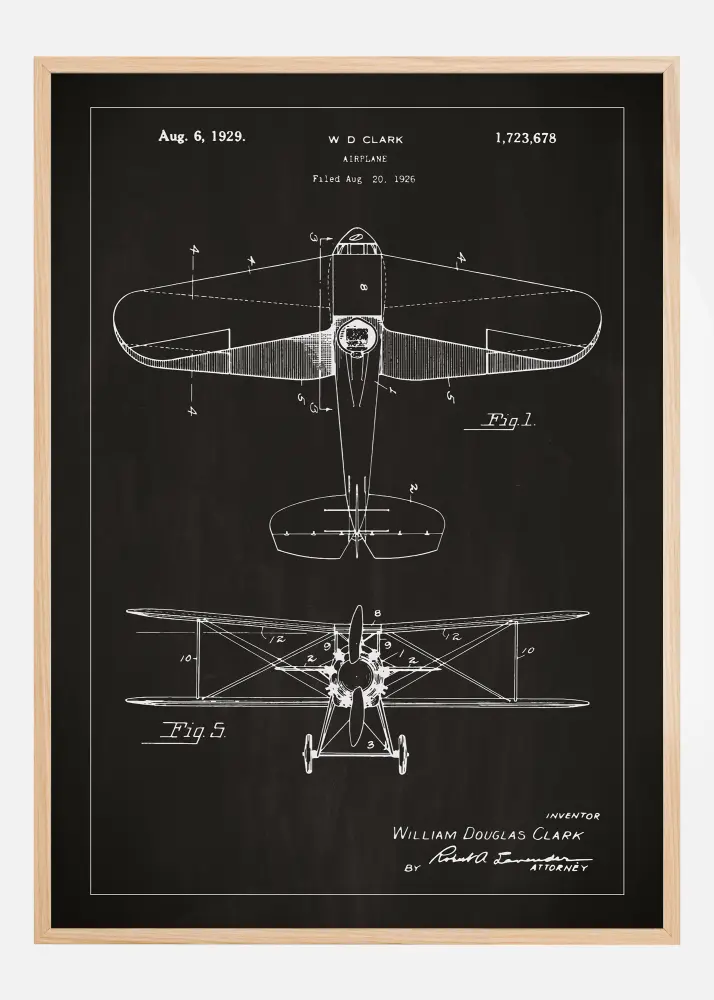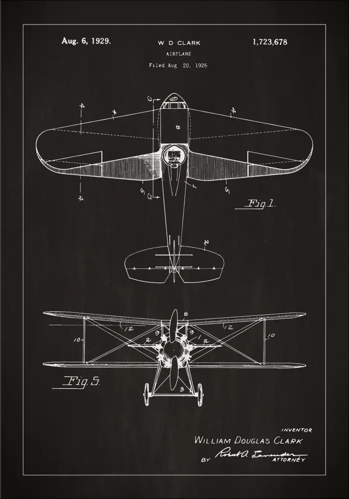 От небето до вашия дом, този патентен постер изобразява дизайна на самолет на У. Д. Кларк, пионерско творение, което получава патент номер 1,723,678 на 6 август 1929 г. Това е истинско представяне на духа на времето, когато авиационната техника прави огромни напредъци. Това точно възпроизвеждане на оригиналните чертежи е почит към тази ера на иновации.