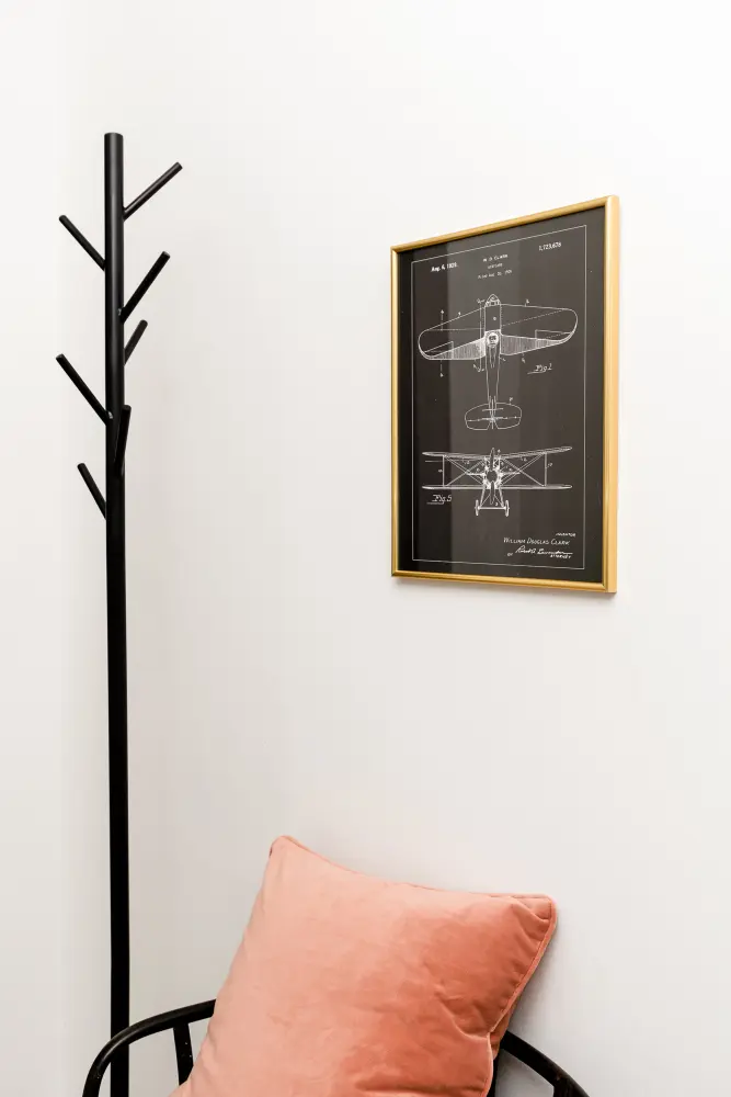 Острите бели линии на постера върху дълбокия тъмносин фон осигуряват ясна и детайлна илюстрация на конструкцията на самолета и създават фокусна точка на стената. Това е идеална стенна декорация за всички любители на летенето и колекционери на исторически иновации, задължителна за всеки, който цени новаторското инженерство от началото на 20-ти век.