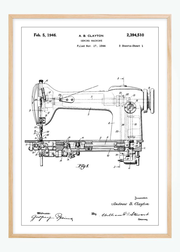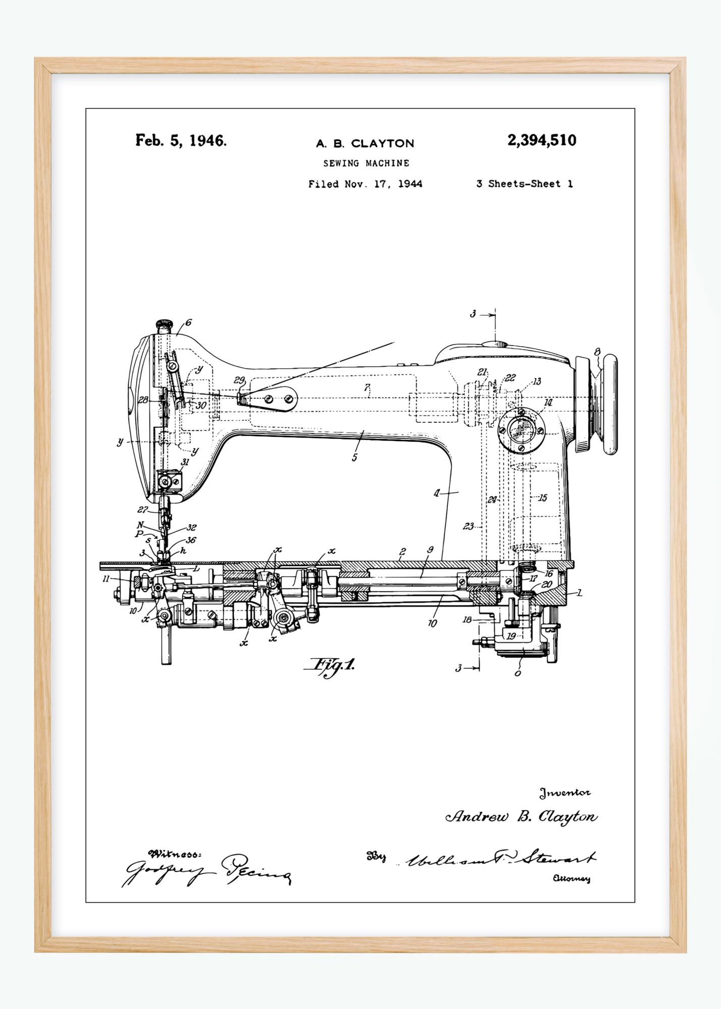 Това подробно патентно чертеж на шевна машина е перфектна илюстрация на индустриалното изкуство и иновации, подписана от изобретателя Андрю Б. Клейтън. Авторското право е датирано на 5 февруари 1946 г. и е архивирано на 17 ноември 1944 г., тази патентна постер представя класическото майсторство и прецизност зад машинното шиене. С неговите сложни компоненти и технически линии, този патентен афиш предлага уникален поглед в техническия напредък на ранния 20-ти век и е стилен интериорен акцент за всеки, който оценява историческата иновация.