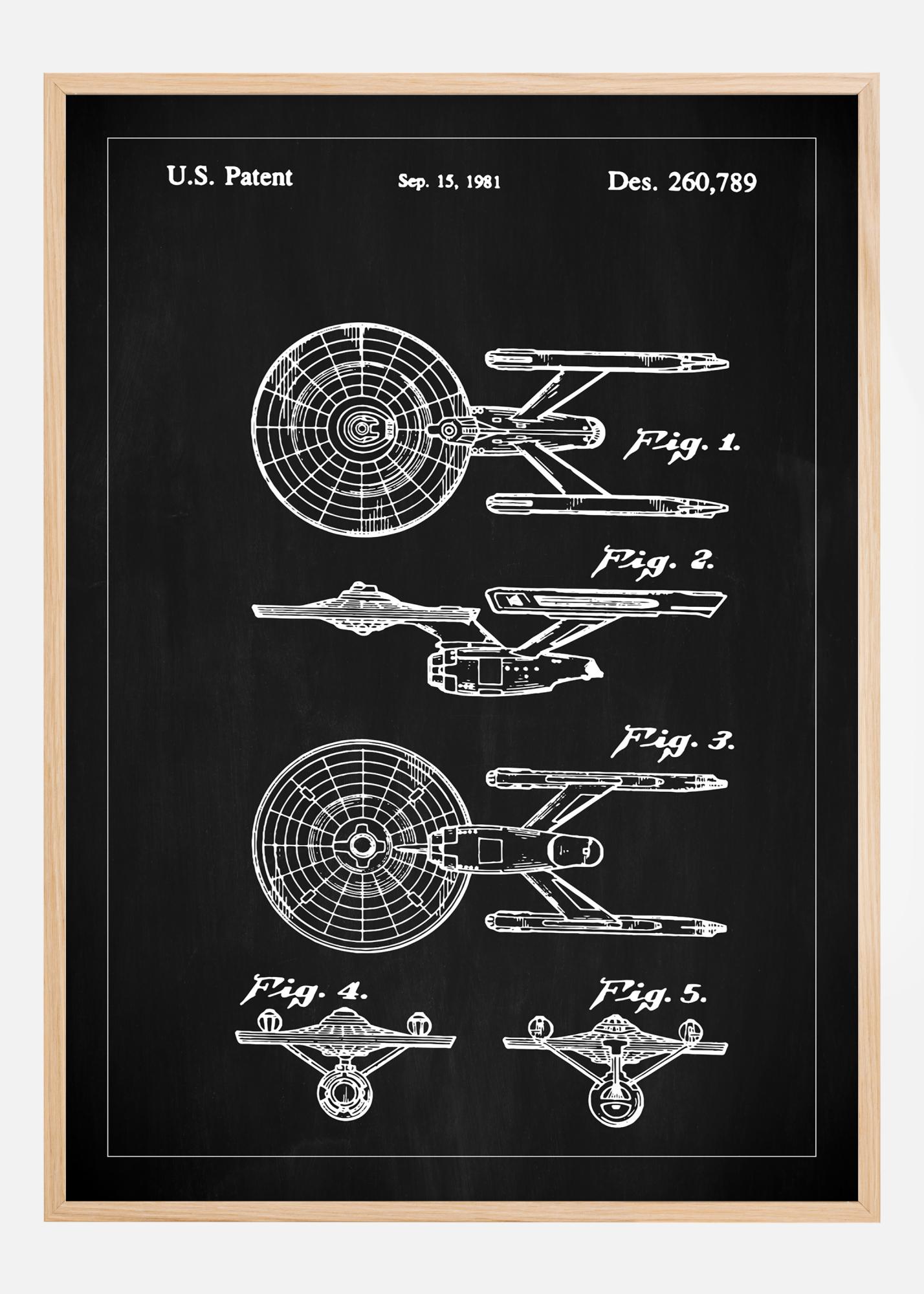 Този патентен постер представя емблематичен дизайн концепция за космическия кораб Enterprise от Star Trek, датирана на 15 септември 1981 г. с патентен номер Des. 260,789. Това е стилизирано изобразяване, което напомня за научнофантастични приключения и междузвездни пътувания. Подробните илюстрации пресъздават формата на кораба от различни ъгли и перспективи, което подчертава както симетрията му, така и сложните му структури. Тази патентна рисунка комбинира научно чудо и естетическо удоволствие и е отличен обект на разговор, който добавя елемент на иновация и вяра в бъдещето към всяка среда.