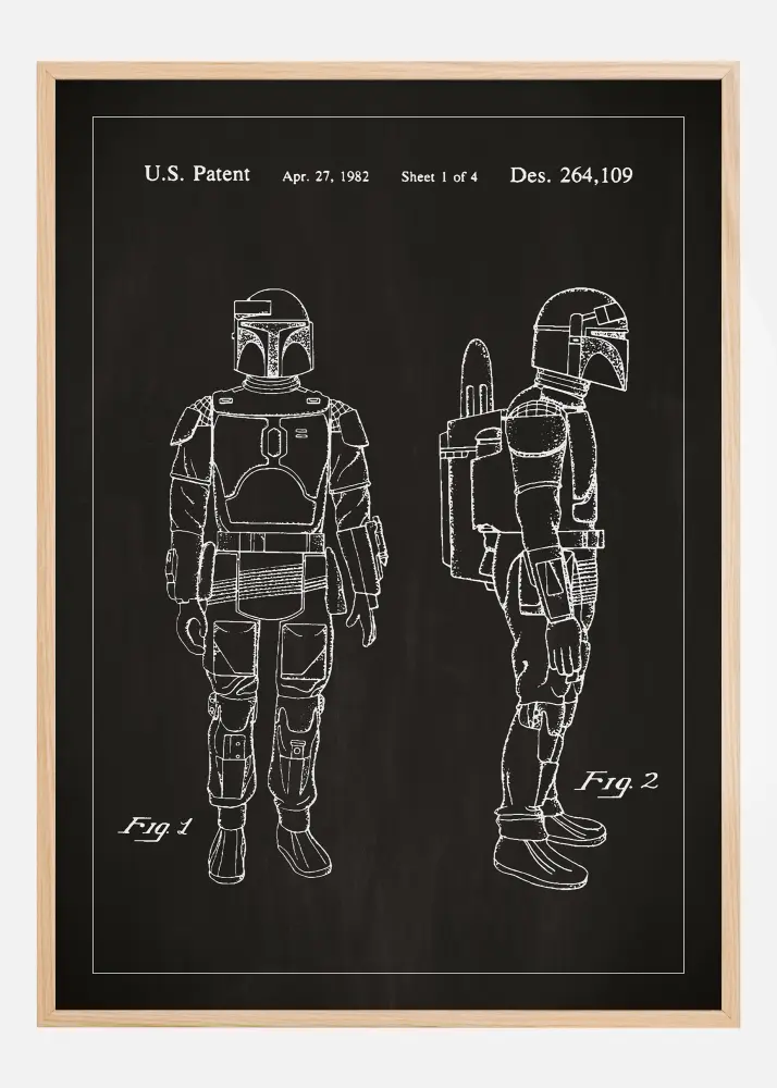Открийте носталгичния чар и иновативния дизайн с нашия ексклузивен патентен плакат, който изобразява класическия костюм на Боба Фет от Star Wars. Тази детайлна патентна чертежка, първоначално подадена в Американското патентно ведомство, представлява завладяваща част от историята на дизайна. Перфектен за ентусиасти на техника и колекционери, този патентен плакат служи като стилно напомняне за креативния стремеж на човечеството и технологичния напредък.