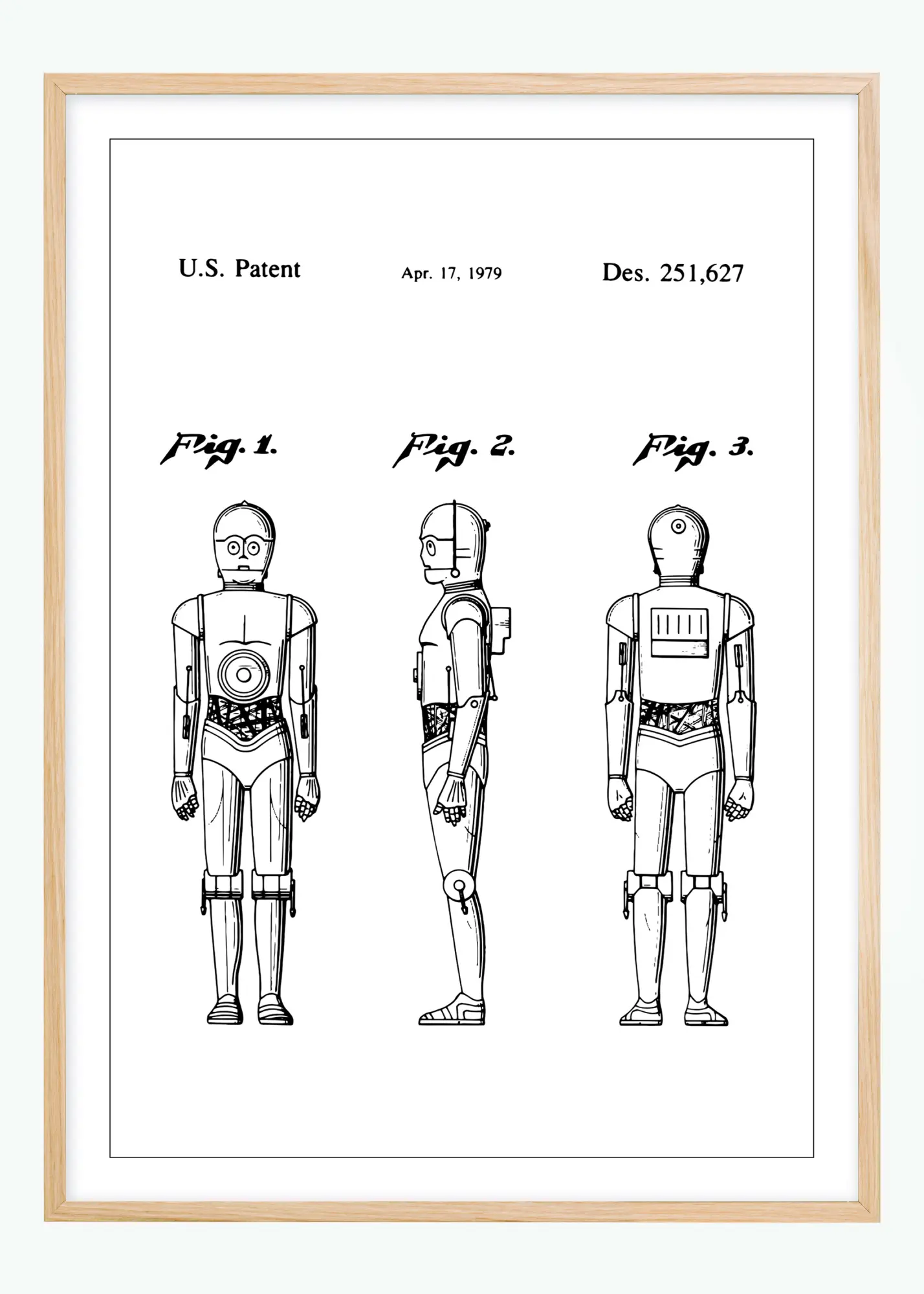 Този уникален патентен плакат изобразява C3PO от StarWars с U.S. патент Des. 251,627, издаден на 17 април 1979 г. Фигурата е изобразена от три различни ъгли, което дава пълно преглед на дизайна. Този плакат улавя ранния интерес към роботиката и потенциалните ѝ приложения. Със своето детайлно и технически представено изображение, това е перфектната стена декорация за ентусиасти на техниката и фенове на ретрофутуризма.