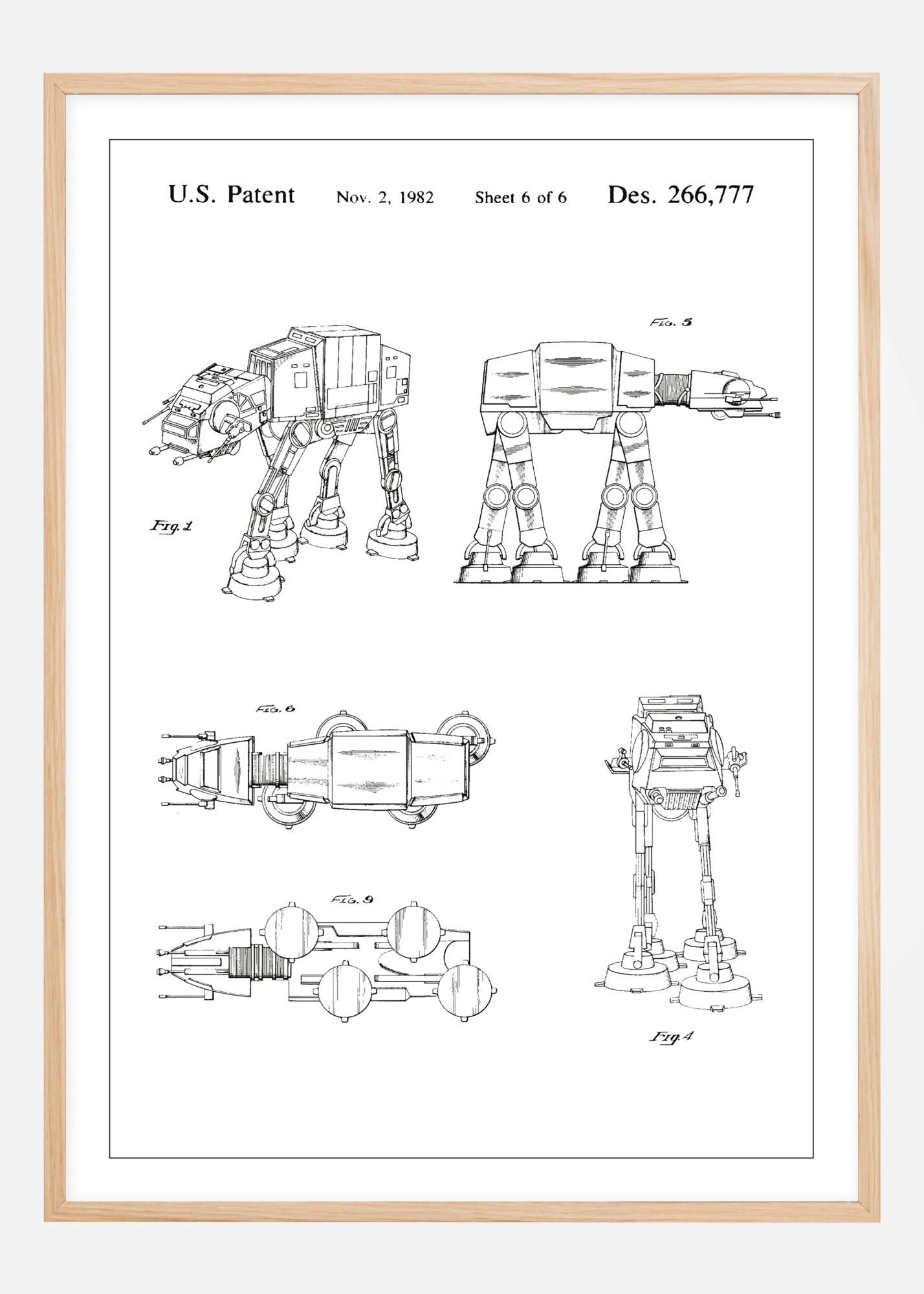 Този елегантен патентен постер е креативно възпроизвеждане на дизайнерския патент Des. 266,777, регистриран на 2 ноември 1982 г. Той показва точни линейни чертежи на ATAT от Star Wars и предоставя на всеки зрител по-дълбоко оценяване на сложността и прецизността, които стоят зад това техническо постижение. Тези патентни рисунки не само че са интелектуално стимулиращи, но са и стилни произведения на изкуството, които добавят индустриален чар към всяка стая.
