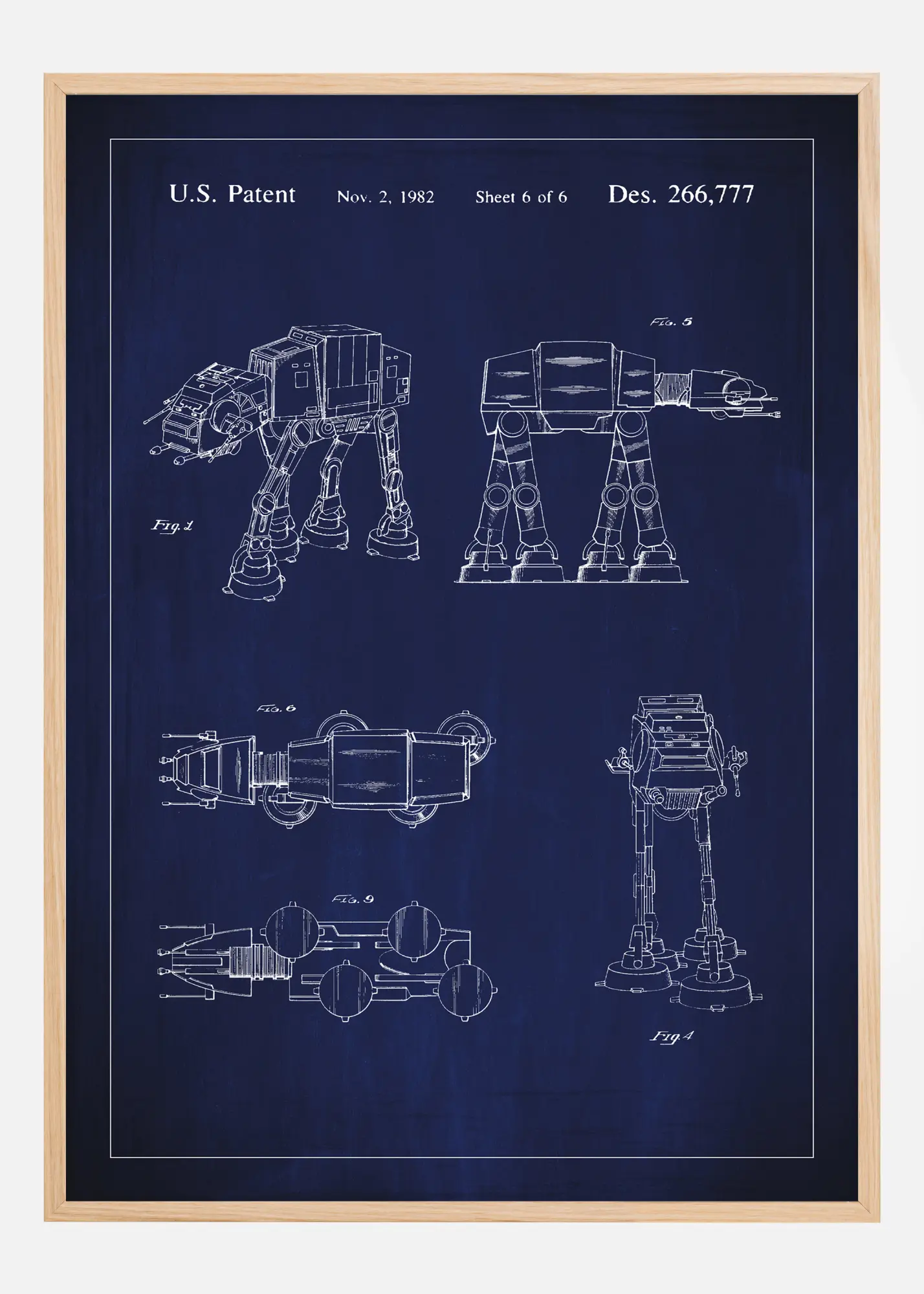 Този изискан патентен постер изобразява отличителните конструктивни чертежи от известния патент за дизайн Des. 266,777, регистриран на 2 ноември 1982 г. Мотивът показва технически чертежи на АТ-АТ от Междузвездни войни в няколко изгледа, като всеки демонстрира уникалната структура и функции на устройството. Той е представен на тъмносин фон, което придава елегантен и модерен израз на бели линирани илюстрации.