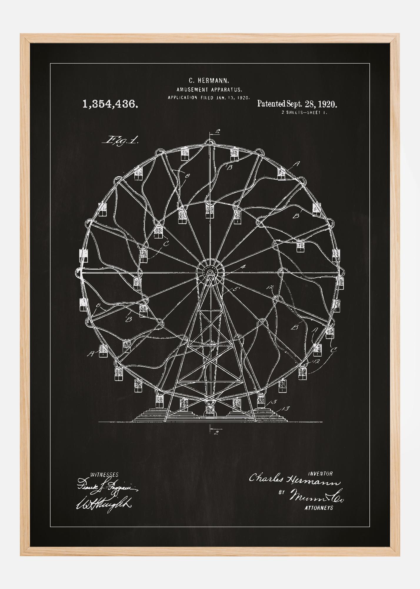 Този патентен постер представя класическата конструкция на С. Херман на увеселителен парк, специфициран в патента с номер 1,354,436, издаден на 28 септември 1920 г. С детайлното си изображение на виенско колело, тази рисунка символизира ера на игрива иновация и е фантастичен интериорен детайл за всеки, който има сърце за исторически увеселителни паркове и технология. Интригуващият дизайн и внимателно изработените детайли привличат вниманието и носят носталгично усещане.