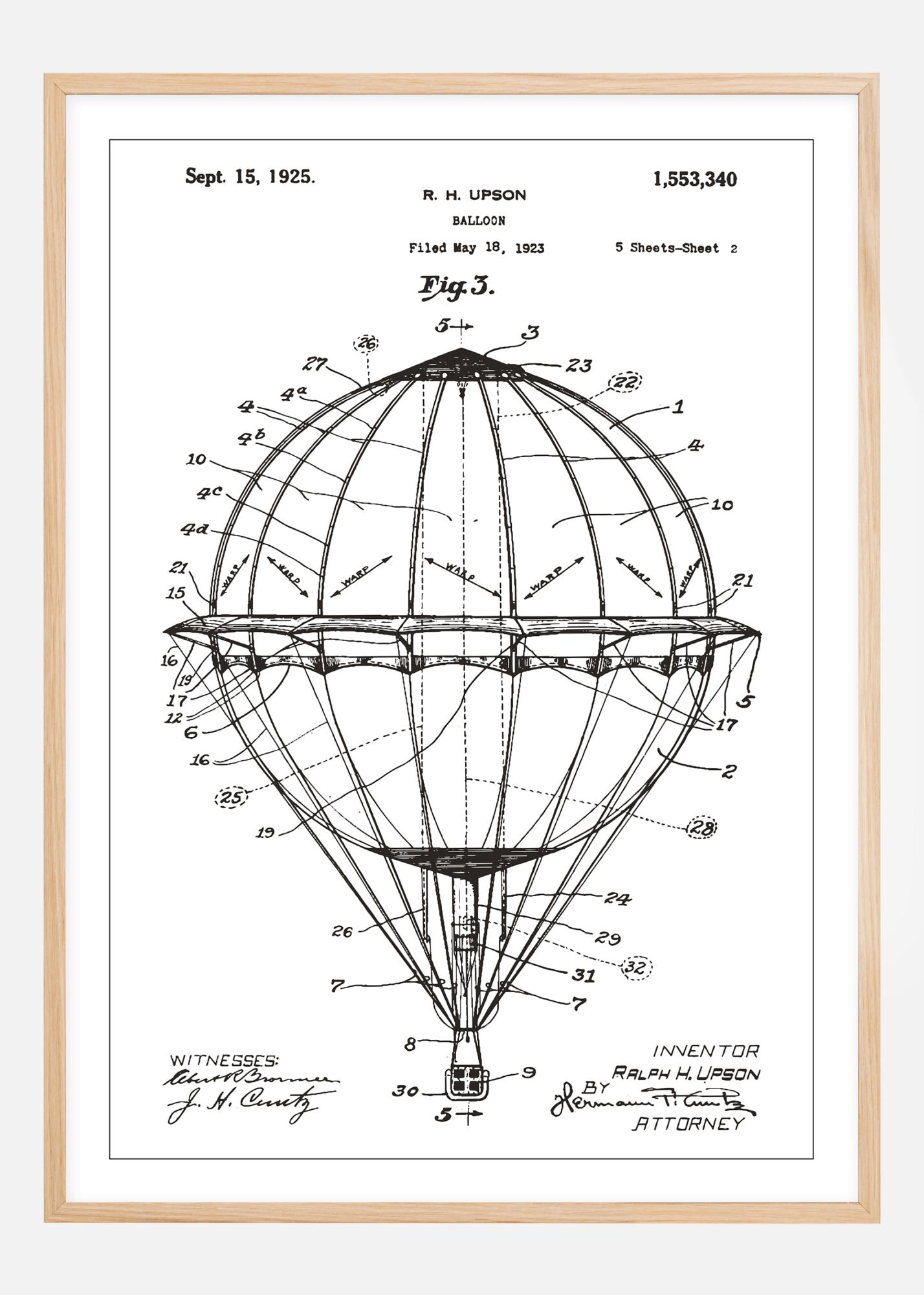 Потопете се в свят на ранна иновация с този ексклузивен патентен постер, който представя дизайна на балон, един от многото големи изобретения на Ралф Х. Ъпсън. Патентът, издаден на 15 септември 1925 г. с регистрационен номер 1,553,340, показва изключителна степен на детайлност и гениалност. Това е идеален художествен детайл за тези, които имат предпочитания към историята на авиацията и конструкцията.
