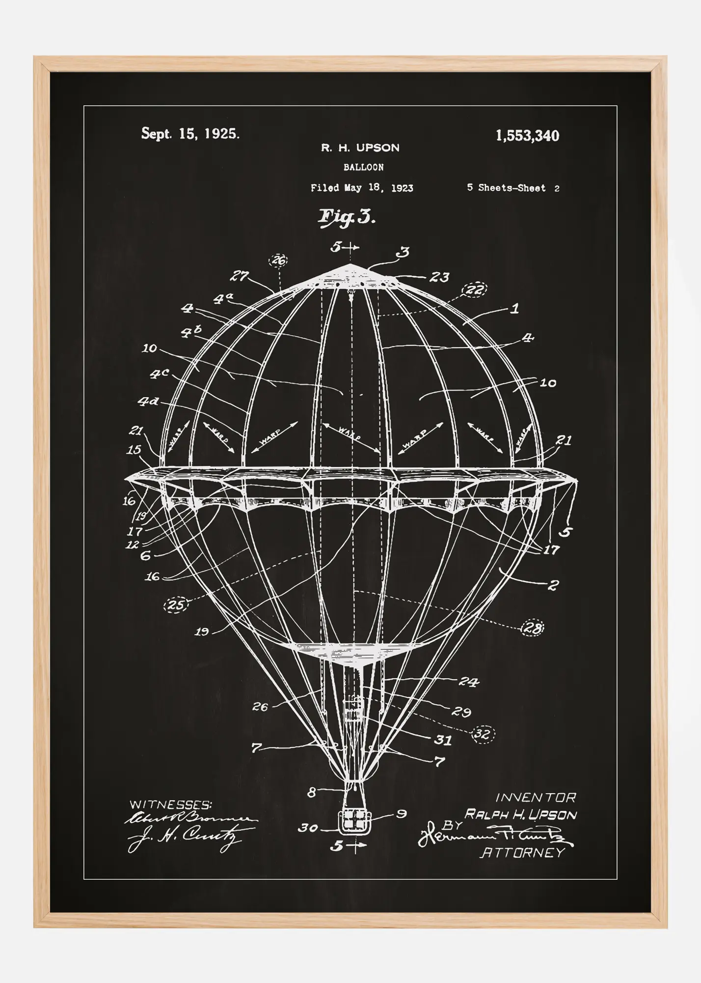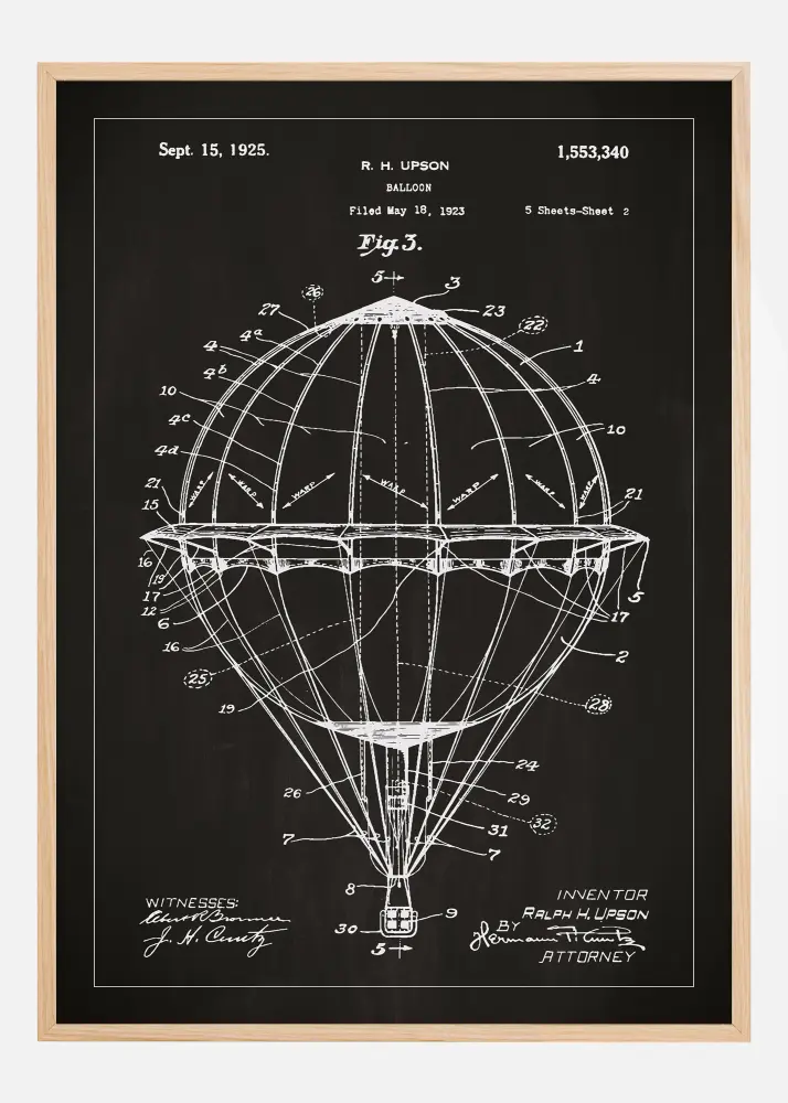 Този уникално изработен патентен постер илюстрира детайлна конструкция на въздушен балон, чийто оригинален патент е създаден от иноватора Ралф Х. Ъпсън. Патентован на 15 септември 1925 г. под номер 1,553,340, това е едно очарователно произведение на ранната аеродинамична инженерия. Този патентен плакат е почит към мечтата да се носим сред облаците и към стремежа на човечеството да изследва небето.