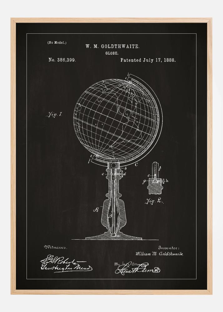 Този патентен постер представя дизайна на W. M. Goldthwaite на класически глобус, детайлно творение, увековечено с патентен номер 386,399 на 17 юли 1888 г. Постерът улавя елегантността и функционалната красота на изобретението, като илюстрира света в две измерения по начин, който вдъхновява открития и изследвания. Неговите прецизни линии и яснота в дизайна го правят отлично педагогическо средство и желана интериорна декорация за всеки, който цени географията и световната история.