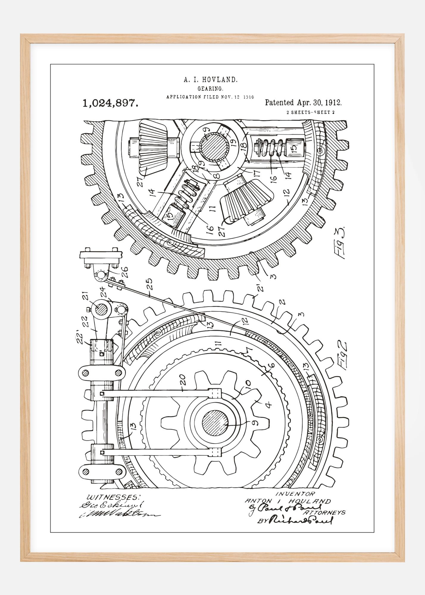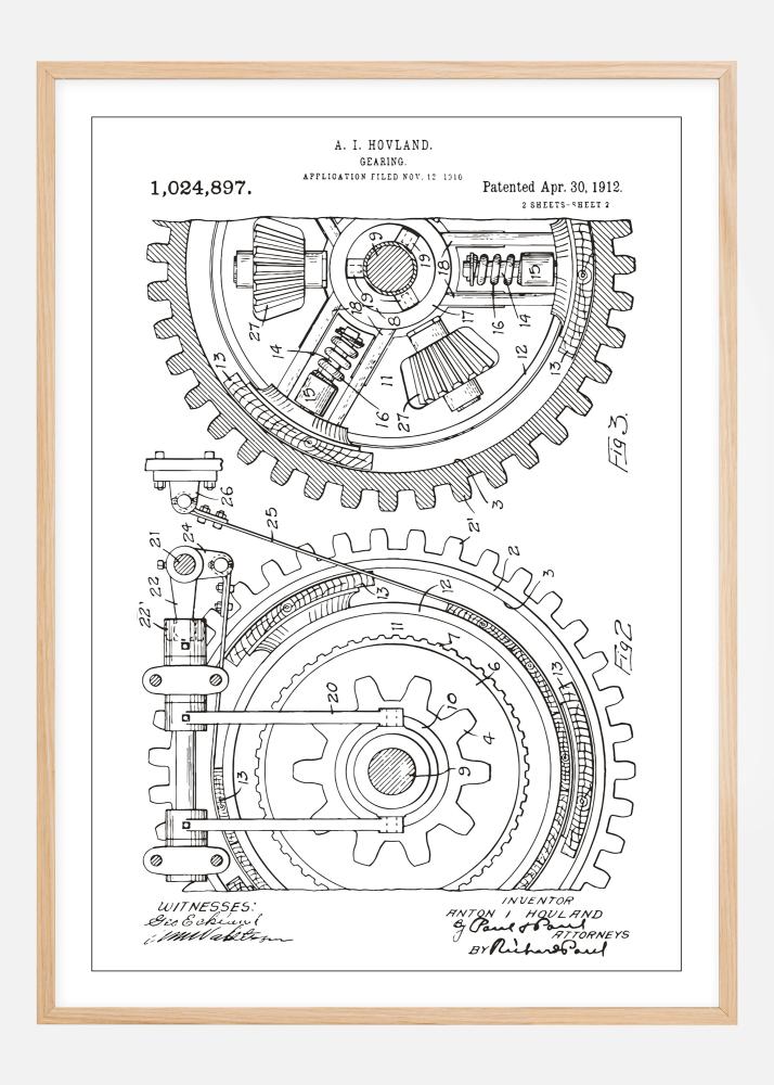 Украсете стената си с този класически патентен плакат, представящ сложния дизайн на скоростна кутия на А. И. Ховланд, патент номер 1,024,897, издаден на 30 април 1912 г. Този подробен чертеж подчертава техническата вещина и сложността на ранните механични конструкции. Изящните линии и внимателните детайли в този патентен чертеж предлагат по-дълбоко разбиране за историята на инженерството и са величествено допълнение към всякакъв технически или индустриален интериорен стил.