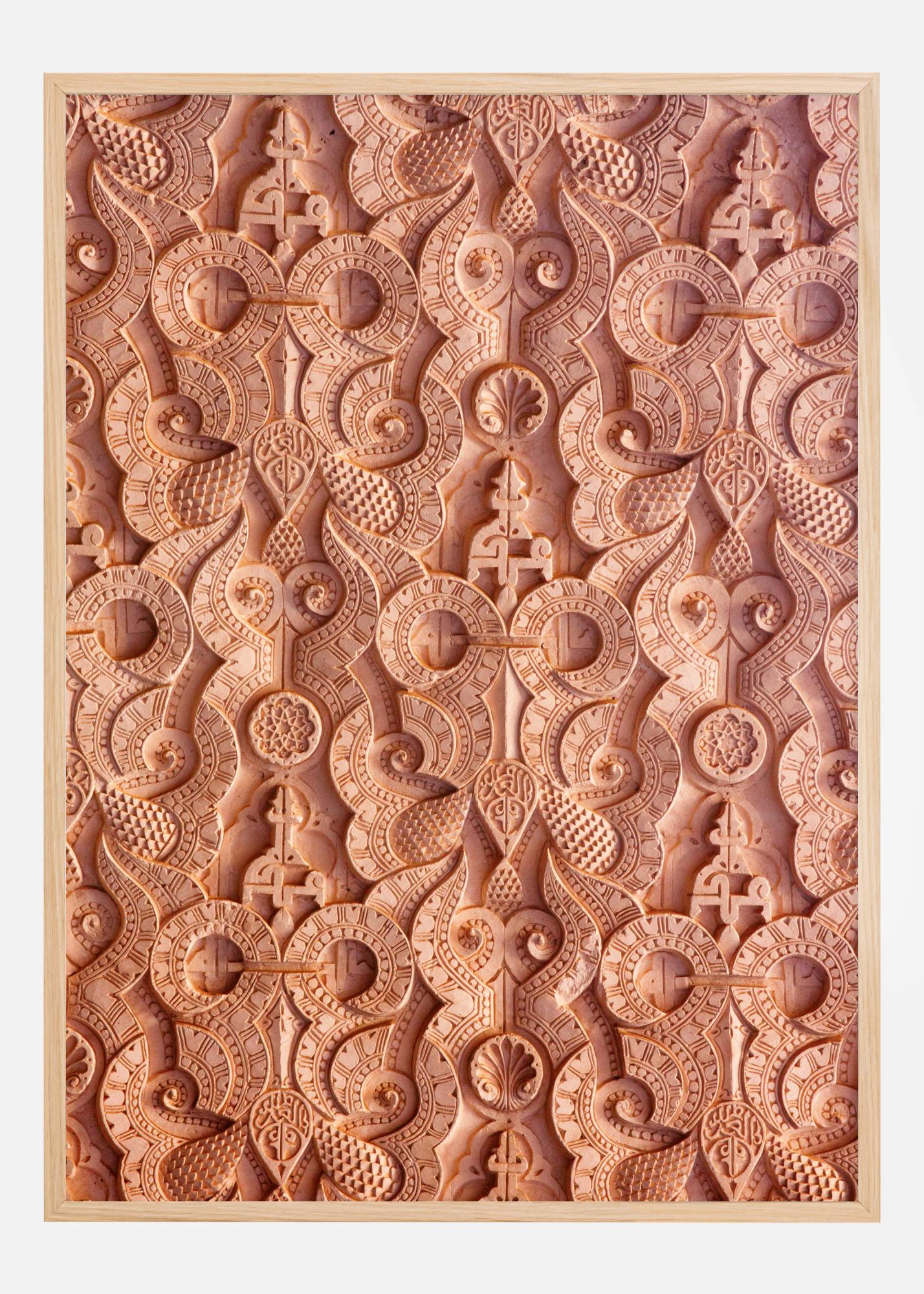 Цветовете в мотива са в палитра от топли теракота и глина, които придават естествено и рустикално усещане на изображението. Детайлният модел се откроява добре на еднородния фон и създава триизмерна илюзия, която е едновременно привлекателна и дълбока. Този постер е идеален за тези, които ценят изкуството, което привлича вниманието и приканва към по-близко изследване, и които ценят майсторството и традицията в своя стил на интериорен дизайн.