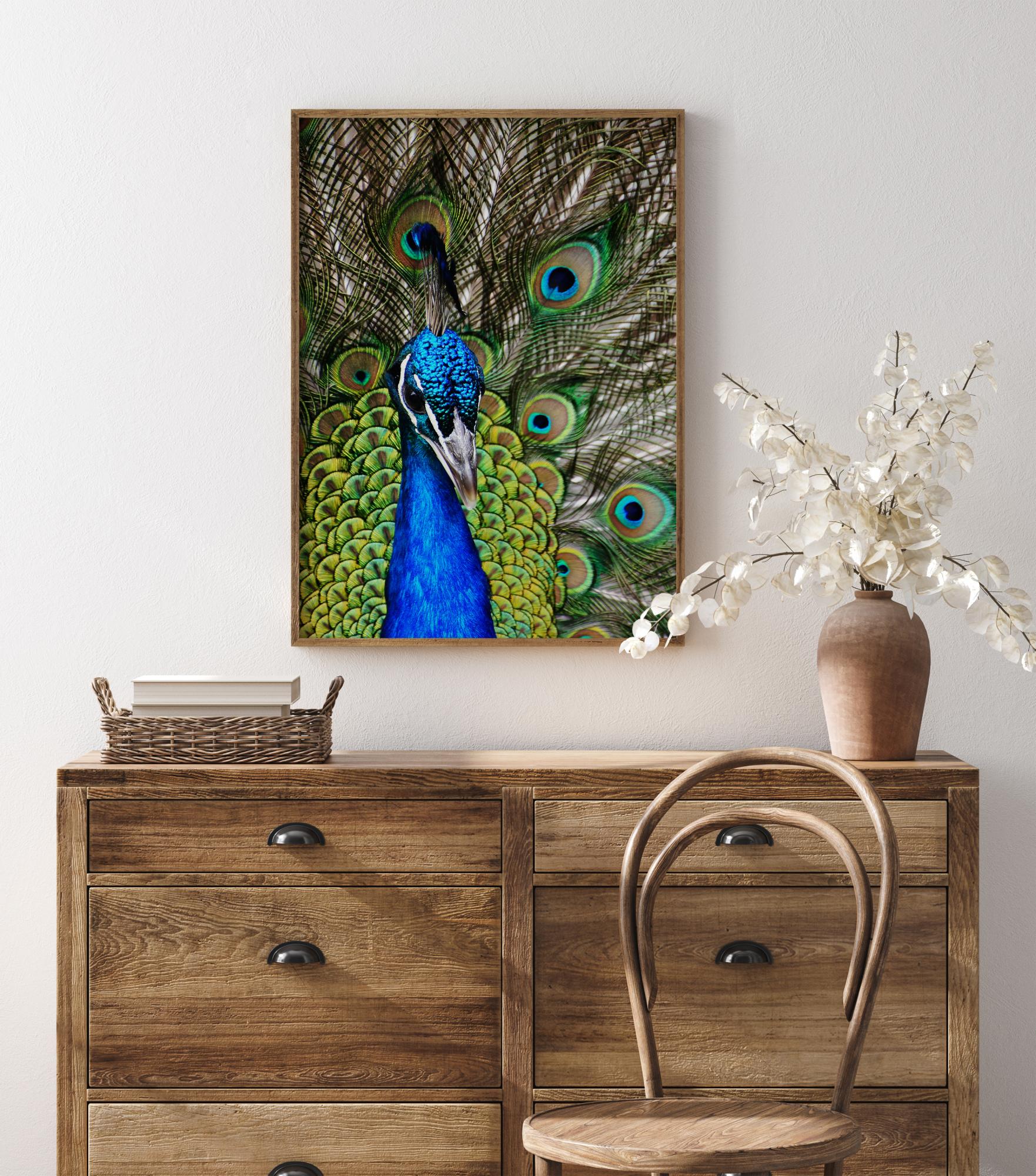 Един фантастичен плакат с близък план на паун. Със своите големи цветни опашни пера и модел с подобие на очи, това цветно същество свети в естествената слънчева светлина. Внесете красотата на птицата в дома си с помощта на този перфектен плакат.