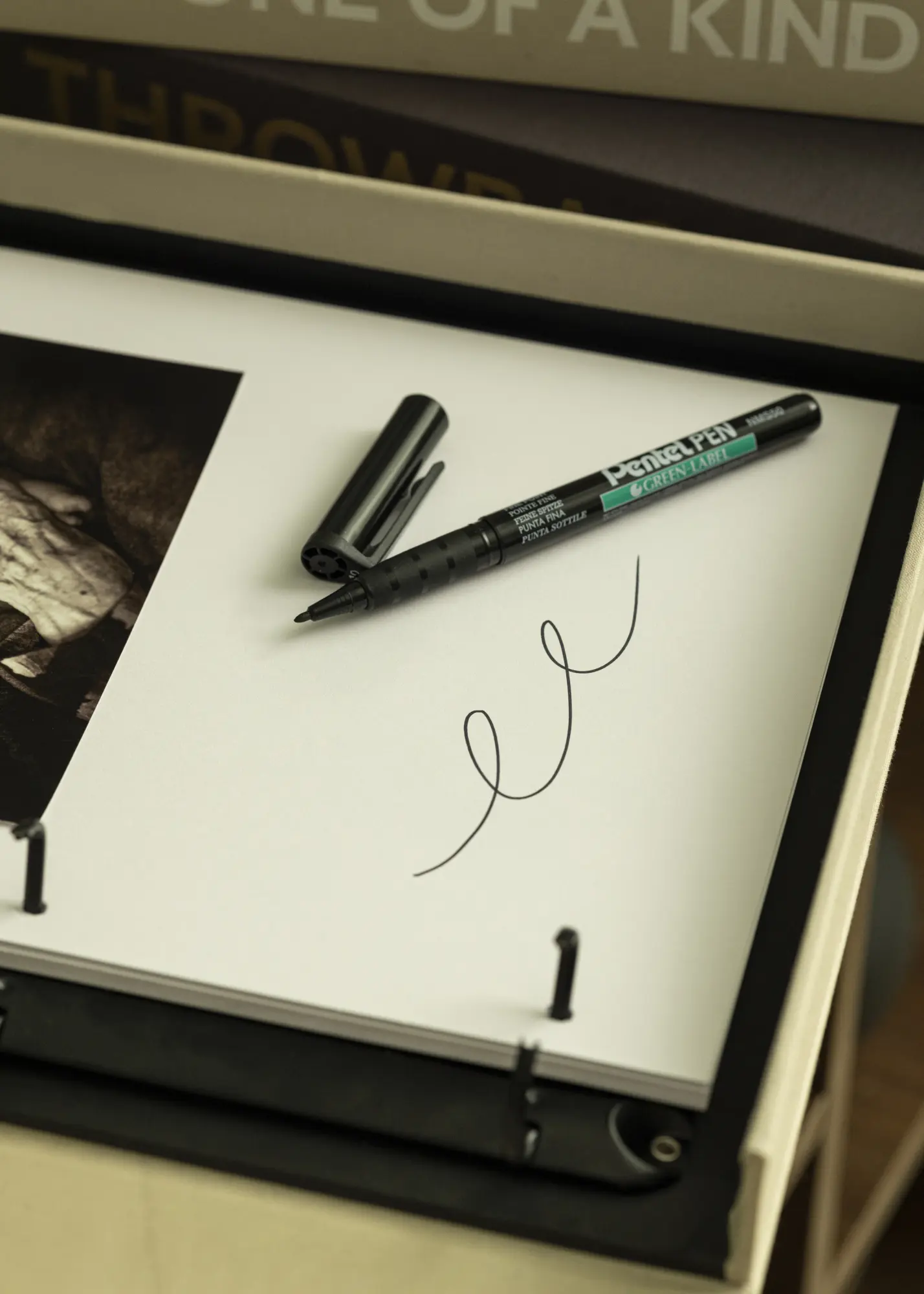 Черна писалка от Pentel, която се прикрепя към повечето повърхности. Писалката има ширина на върха от 0,8 мм