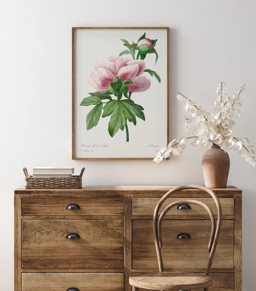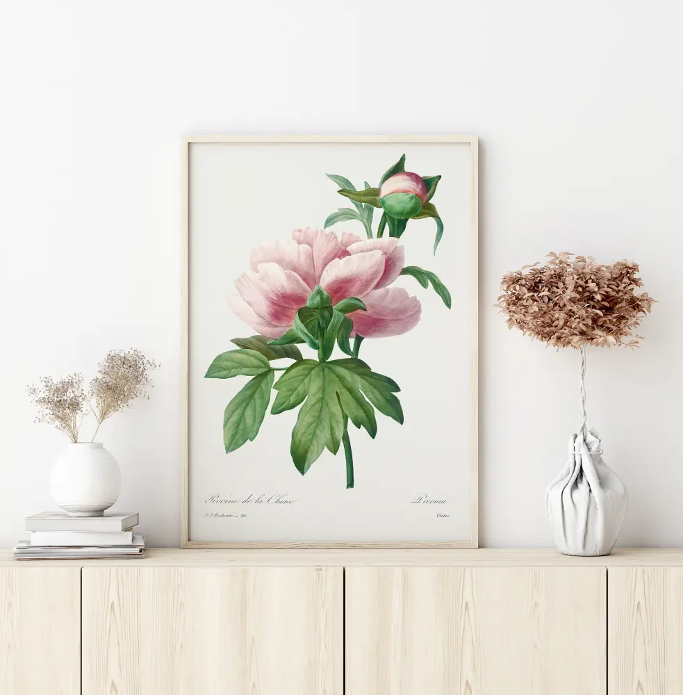 Артистичен плакат с пионовото стъбло и розово цвете. На бежов фон розовото цвете е разположено върху фигура с цвят на праскова, докато листата са скицирани в черно. Пренесете тази цветна нежност в дома си.