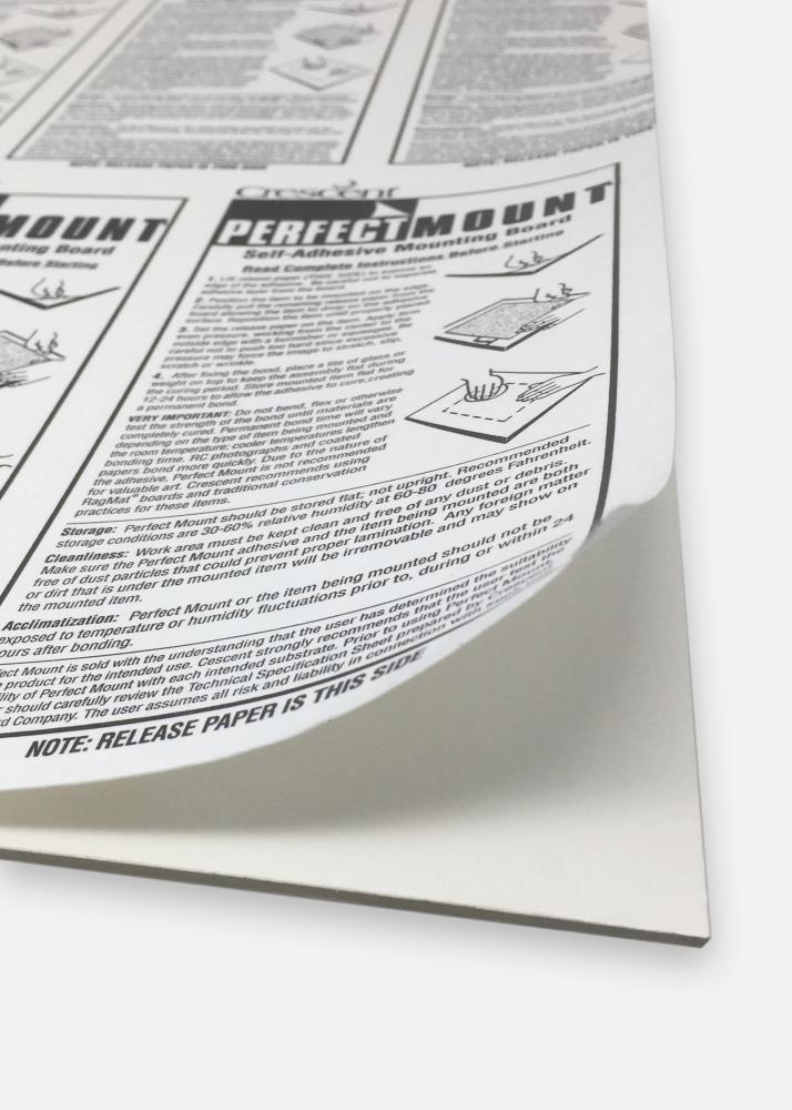 Perfect Mount е монтажна плоча с дебелина 1,4 милиметра с двойно залепващо лепило за монтиране на картини и фотографии. Плочата, разбира се, е безкиселинна и неутрална по отношение на pH за най-добро съхранение на вашите снимки. Лепилото върху плочата се активира чрез натиск, което означава, че можете да поставяте и премахвате изображението, докато не сте доволни. За да премахнете евентуални мехурчета, можете да гладите с мека кърпа или памучна ръкавица върху повърхността на изображението, от средата навън. След това плочата се поставя под натиск, за да се закрепи изображението трайно.
